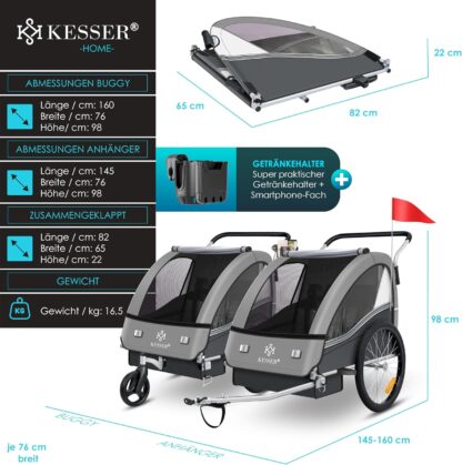 – Afmetingen buggy/aanhanger: 90cm x 75cm x 160cm (HxBxD)