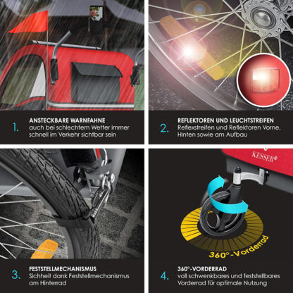 Een vergrendelingsmechanisme voorkomt dat de aanhanger wegrolt. Daarnaast zorgen reflectoren op elk wiel, een veiligheidsvlag en reflectoren aan de voor- en achterzijde voor optimale zichtbaarheid in de schemering en bij regen.