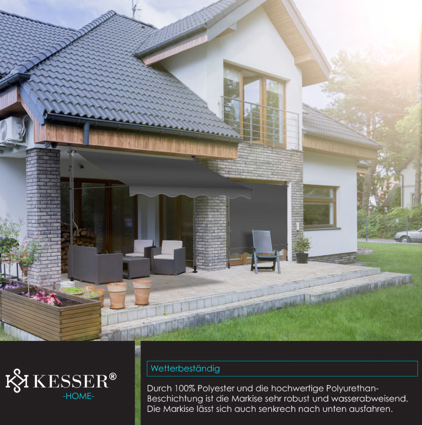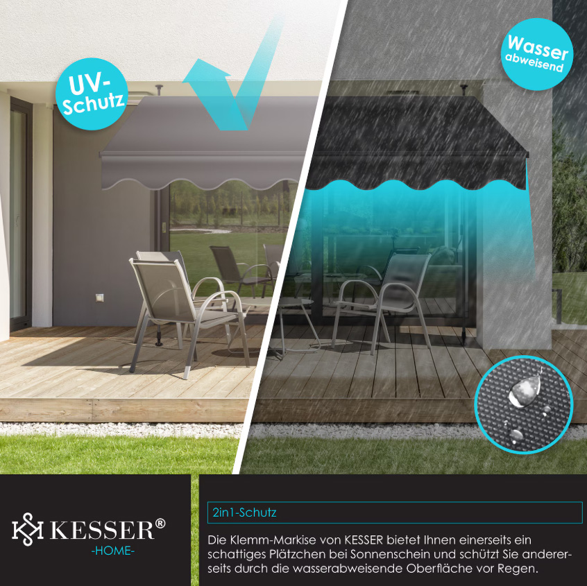 Deze zomer bent u gegarandeerd optimaal beschermd tegen de zonnestralen. Dankzij de hoogwaardige polyurethaancoating is het zonnescherm niet alleen UV-bestendig, maar ook water- en vuilafstotend. Dankzij het robuuste en hoogwaardige materiaal kan de luifel eenvoudig worden verwijderd en gereinigd.