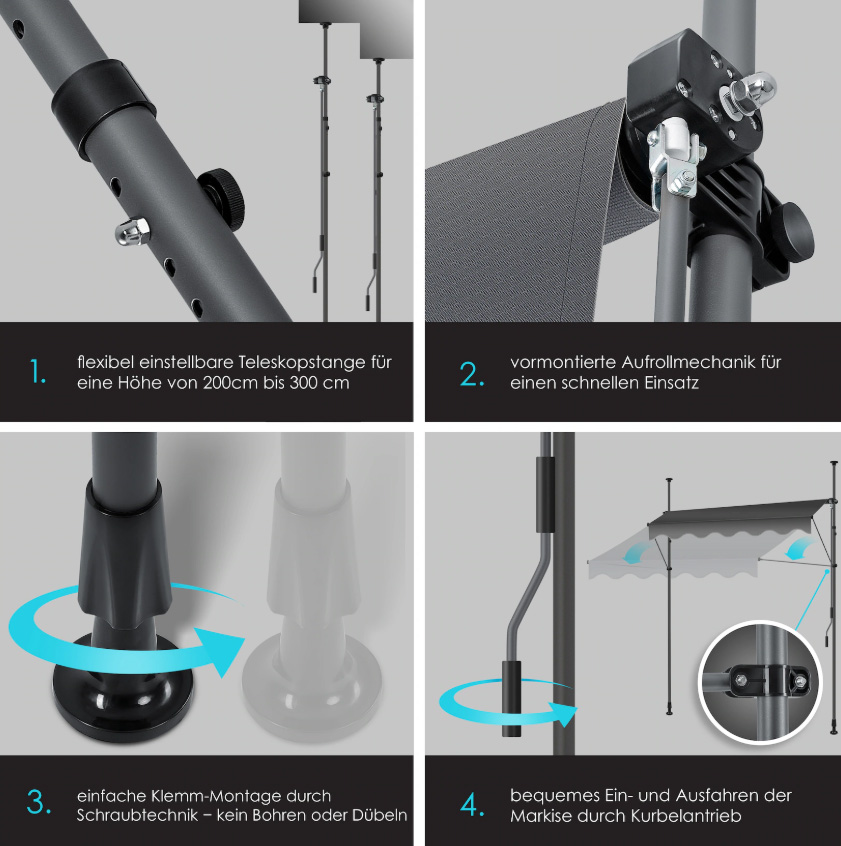 Ook de montage is snel en eenvoudig. Het in hoogte verstelbare frame is voorzien van een klemmechanisme en kan daardoor eenvoudig worden bevestigd. De hoogte is flexibel te kiezen van 210-300 cm en daardoor multifunctioneel inzetbaar. Boren of deuvelen is niet nodig, een eenvoudige kleminstallatie met schroeftechnologie bespaart u deze moeite en vuil.