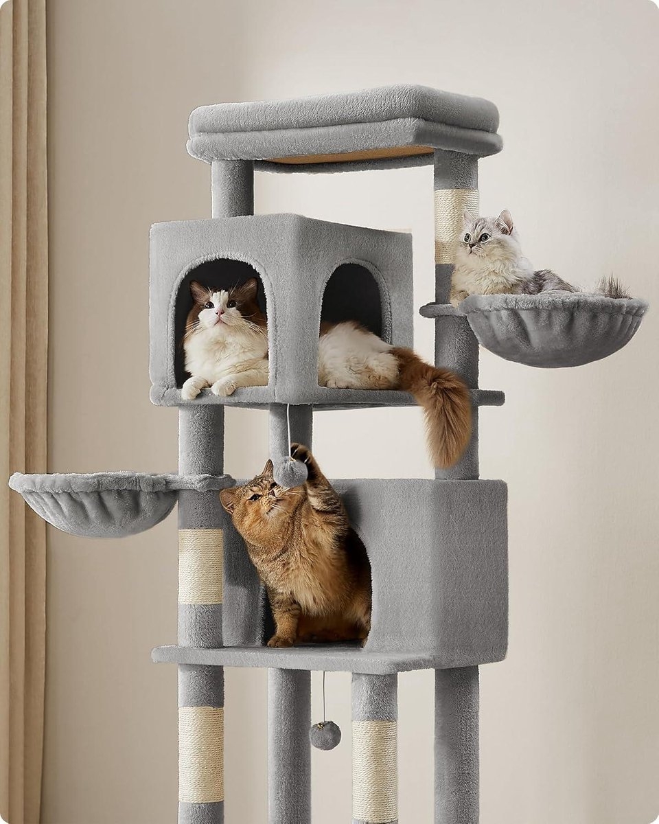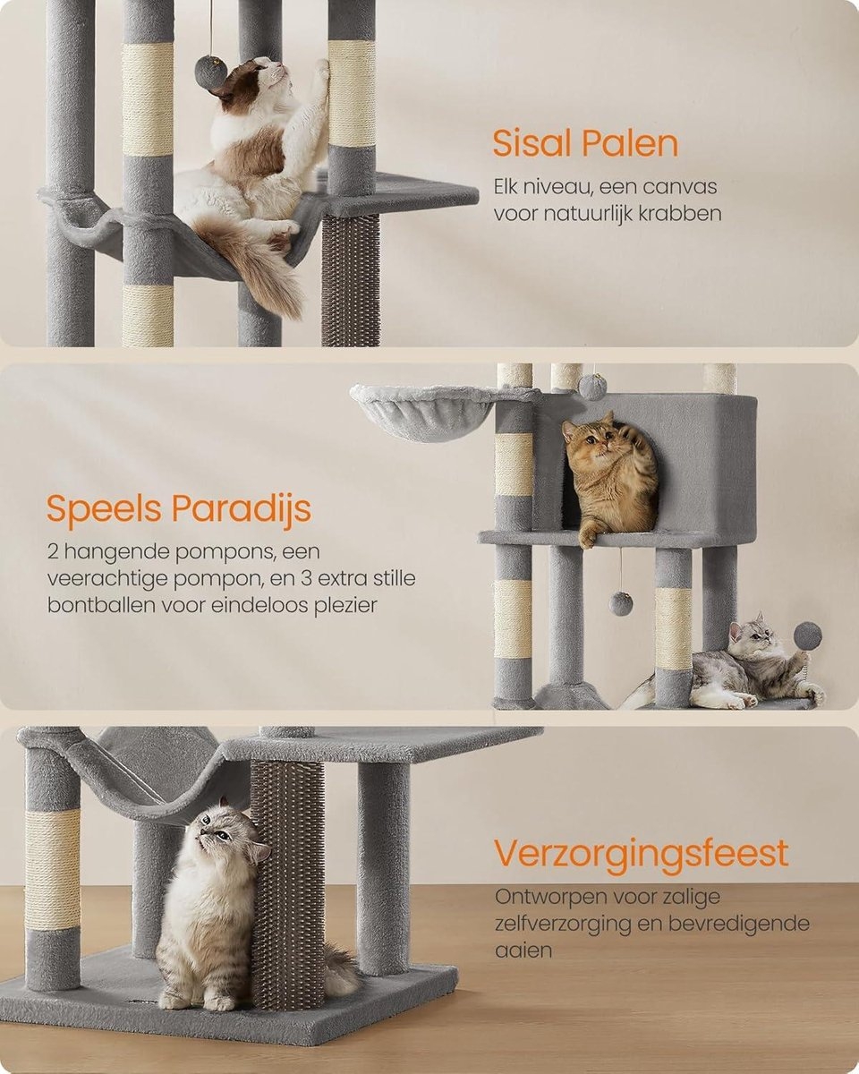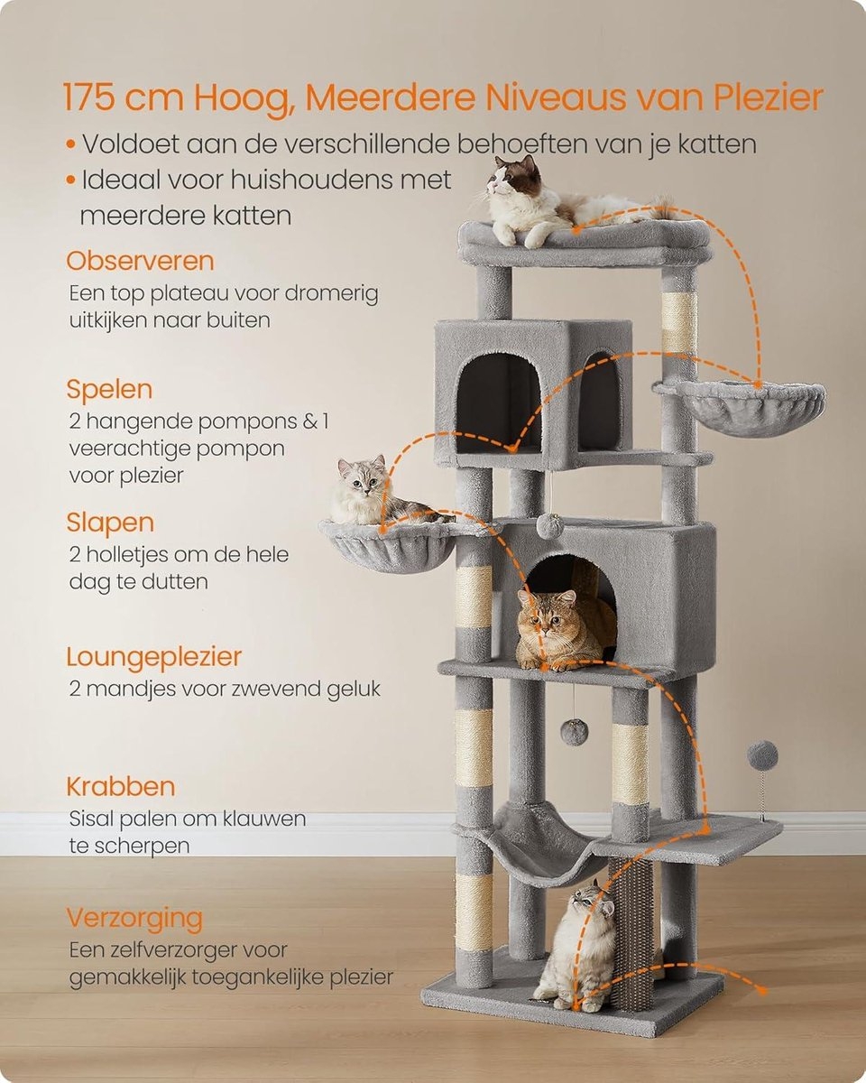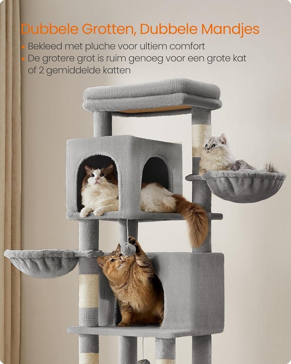 Deze krabpaal van 175 cm hoog biedt meervoudig plezier voor jouw geliefde katten. Met verschillende elementen zoals holletjes, ligbakken, een hangmat, een groot platform en speelgoed is deze krabpaal ideaal voor huishoudens met meerdere katten.