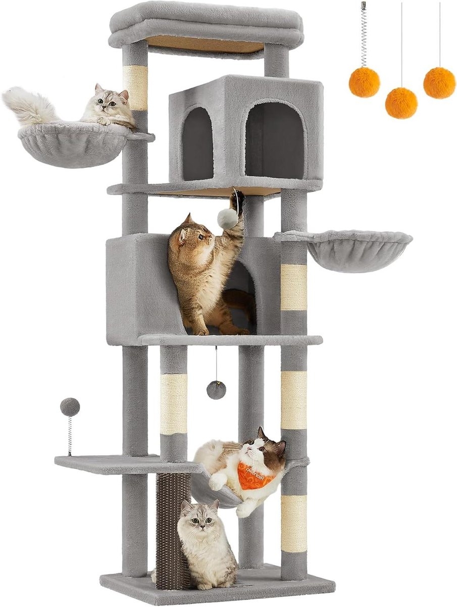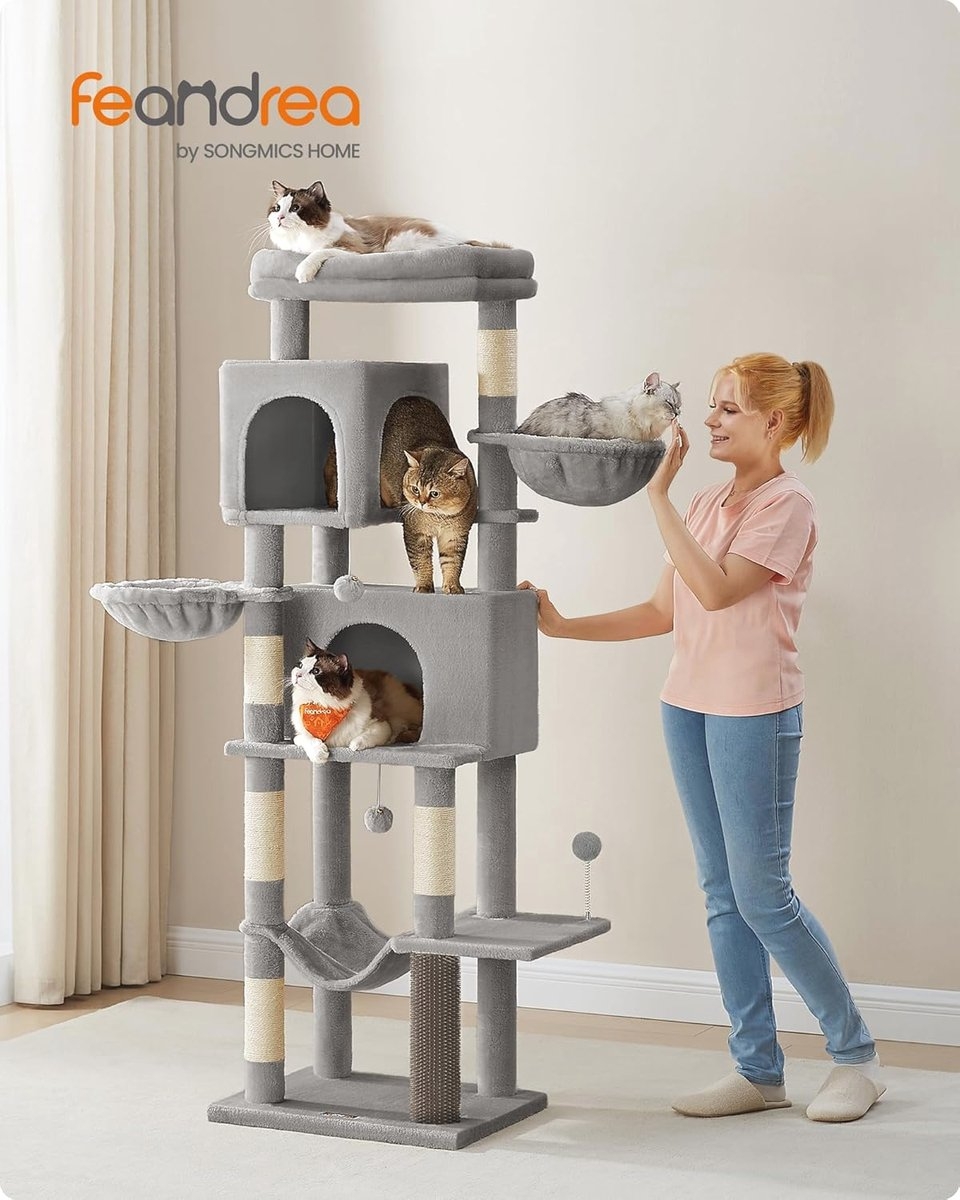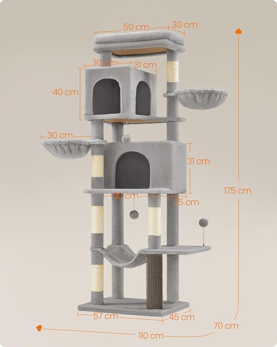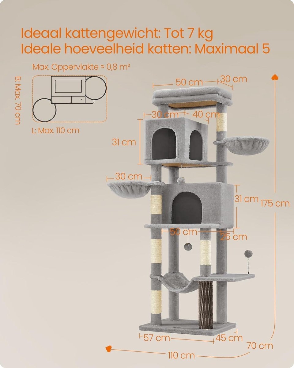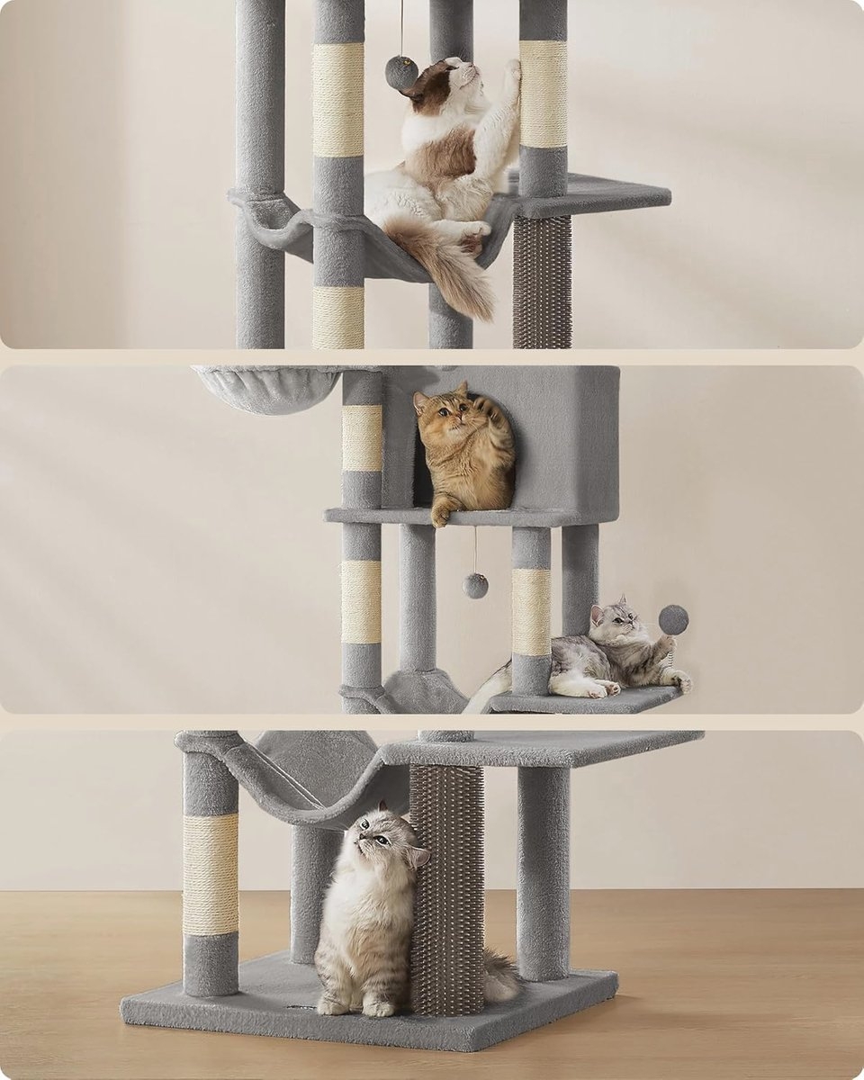 Deze krabpaal van 175 cm hoog biedt meervoudig plezier voor jouw geliefde katten. Met verschillende elementen zoals holletjes, ligbakken, een hangmat, een groot platform en speelgoed is deze krabpaal ideaal voor huishoudens met meerdere katten.