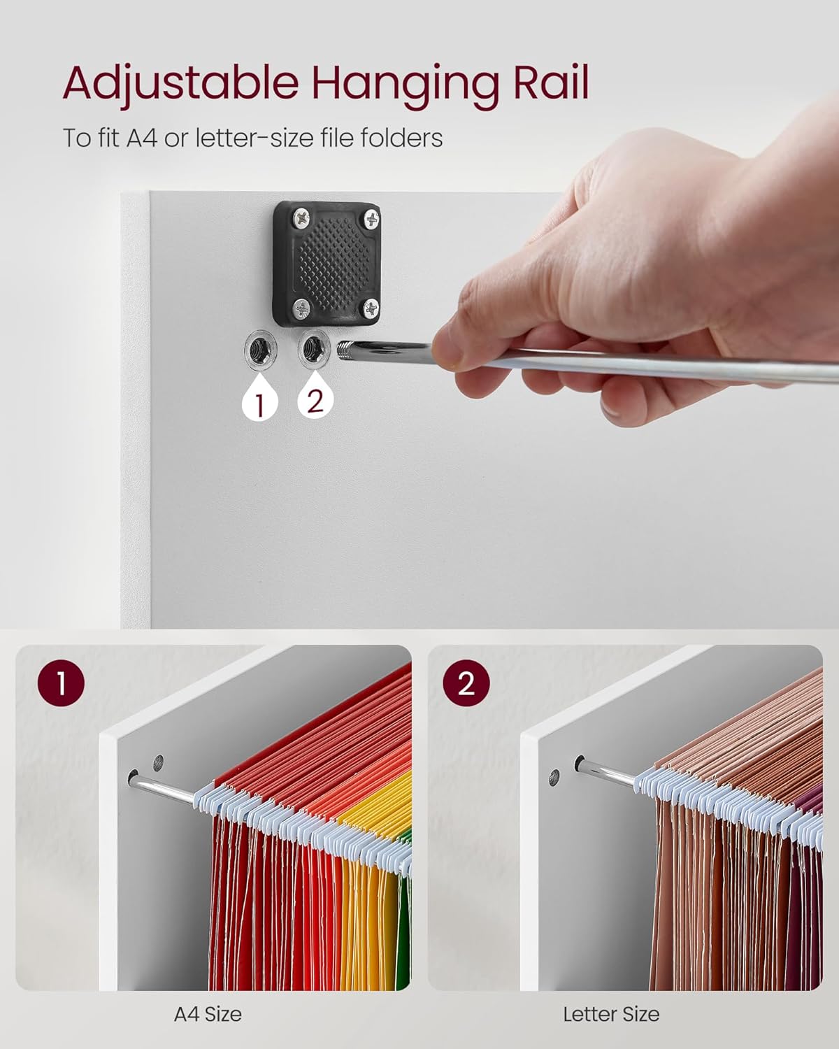 Voor mappen in A4- en Letter-formaat kunt u de positie van de verstelbare ophangstang in elk van de 3 laden aanpassen om mappen van verschillende formaten op te hangen.