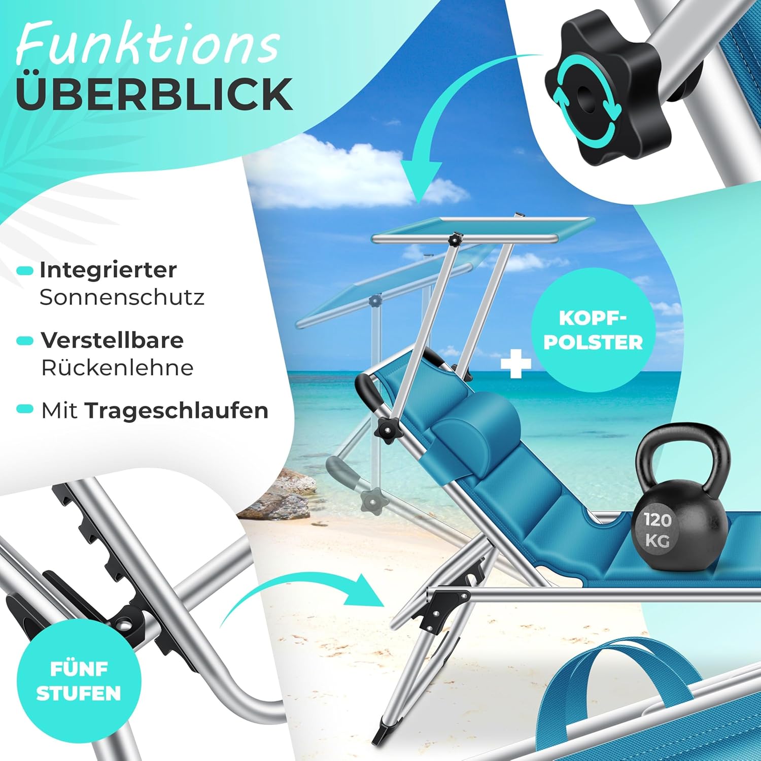 Met de 4 in hoogte verstelbare rugleuning geniet je van een horizontale ligpositie die niet comfortabeler kan zijn. Een individueel verstelbare hoofdsteun met elastiekhouder maakt de ontspanningservaring compleet. Ontspan met onze ligstoel – omdat je het verdient.
