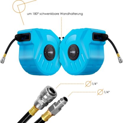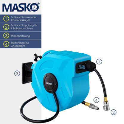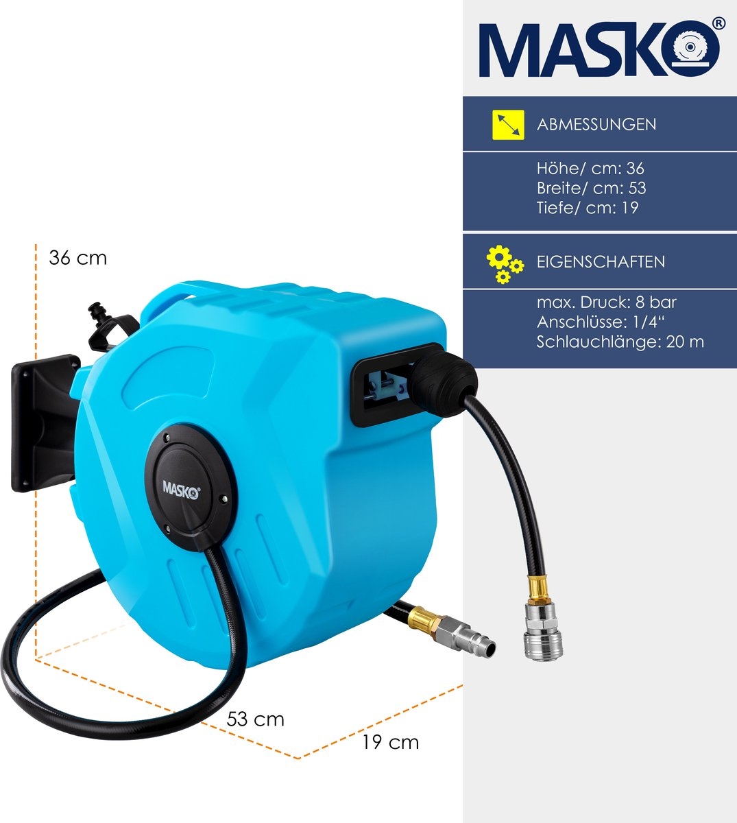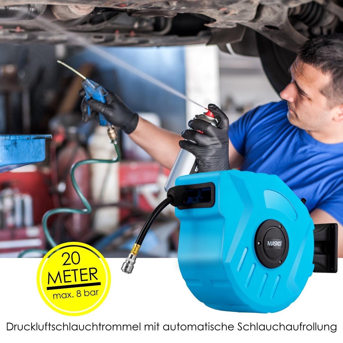 Of het nu in een professionele werkplaats, garage, hobbykelder, op de boerderij of in de tuin is – met de MASKO automatische luchtslangoproller gaat het werk moeiteloos. Met onze slangen van 10m – 30m hoeft u de compressor nooit meer te verplaatsen en heeft u voldoende bereik om ideaal te kunnen werken.