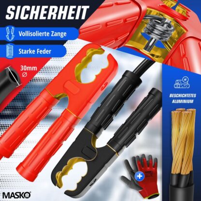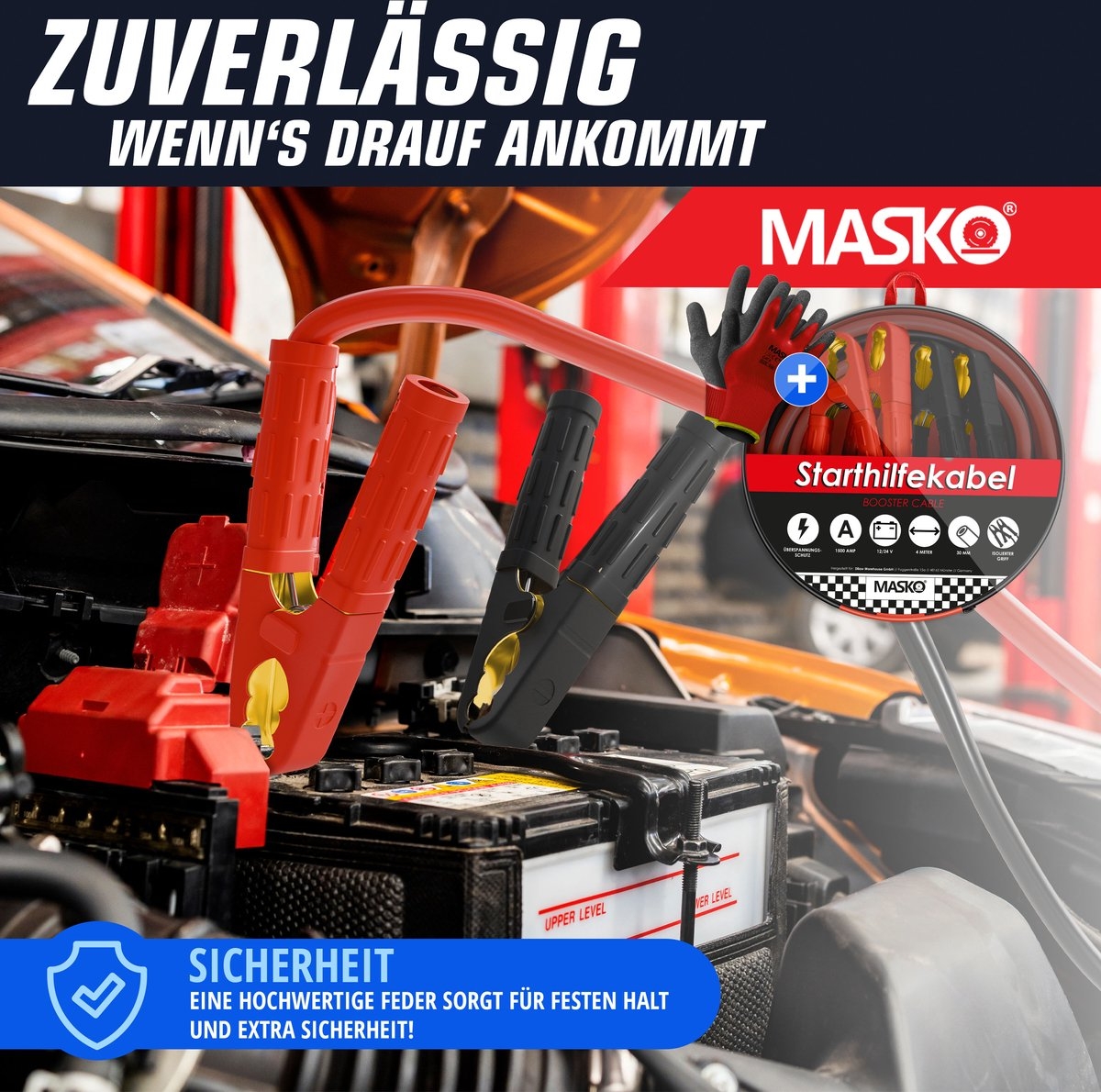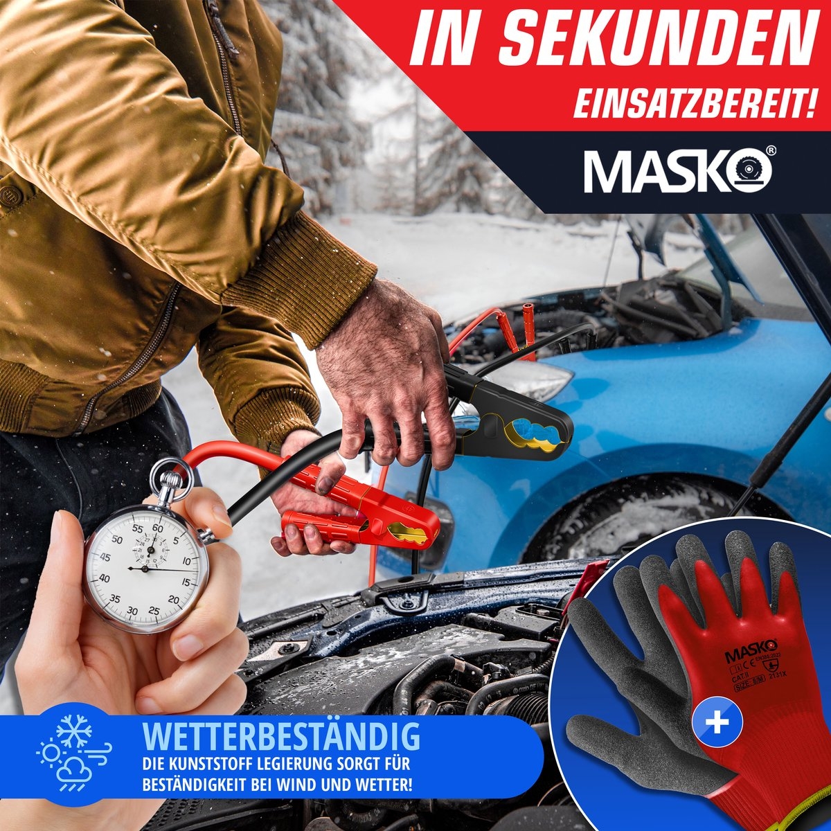 VEILIG JUMPEN: De meegeleverde montagehandschoenen van het merk MASKO zorgen voor een veilige plaatsing van de paalklem – en beschermen je zo tegen elektrische schokken of onbedoeld wegglijden. Een ander belangrijk punt voor de veiligheid is de bestendige en volledig doorlopende kunststofmantel. Uitgerust met de verplichte overspanningsbeveiliging rijd je met onze bougiekabel beslist de juiste kant op!
