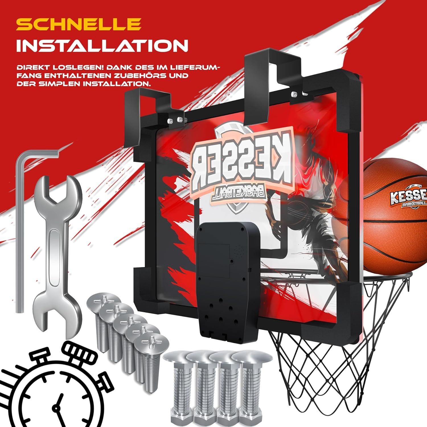 De installatie is kinderspel! Onze indoor basketbalring kan eenvoudig worden opgehangen aan elke standaarddeur in uw huis of kantoor, of aan de balustrade van uw tuin. Dankzij de meegeleverde haken met hoge kleefkracht is het niet nodig om te ponsen, maar indien gewenst kunnen er ook extra schroeven worden gebruikt. Zo kun je overal en altijd van het spel genieten.