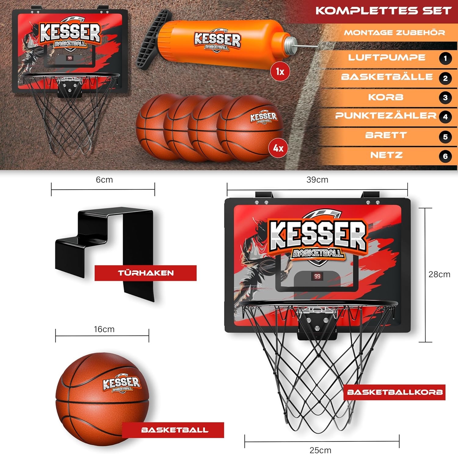 – Afmetingen basketbalring: 39 cm x 28 cm (BxH)