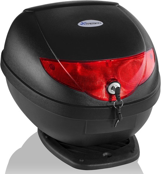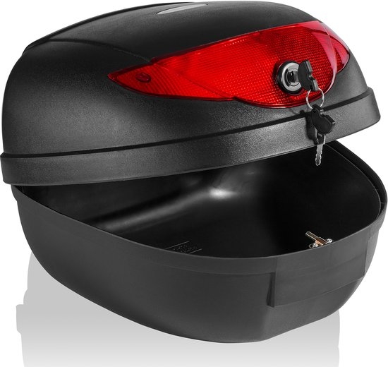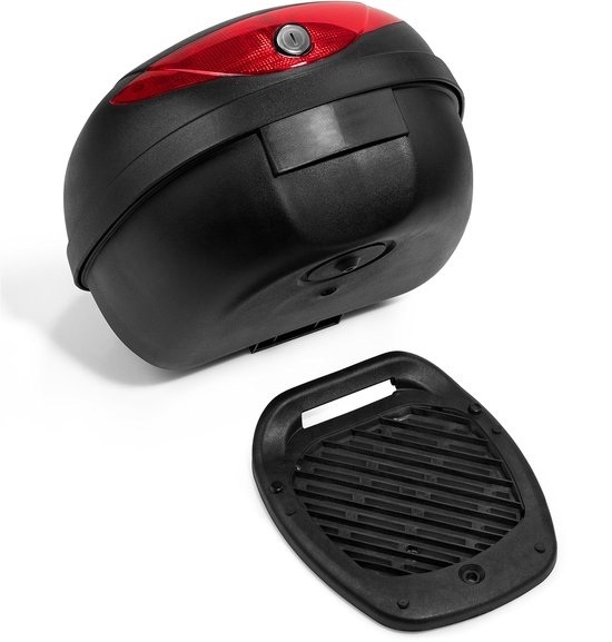 Deze stevige, matzwarte kunststof koffer is voorzien van een grote reflecterende strip voor extra veiligheid op de weg. Dankzij de speciale coating zijn opspattend water gemakkelijk weg te vegen. Geschikt voor alle scooters, motoren, bromfietsen of ATV’s met een bagagedrager. Er past een helm in, met extra veiligheid dankzij de grote reflecterende strip. Het snelmontagesysteem maakt snelle en eenvoudige bevestiging aan uw bagagedrager mogelijk.