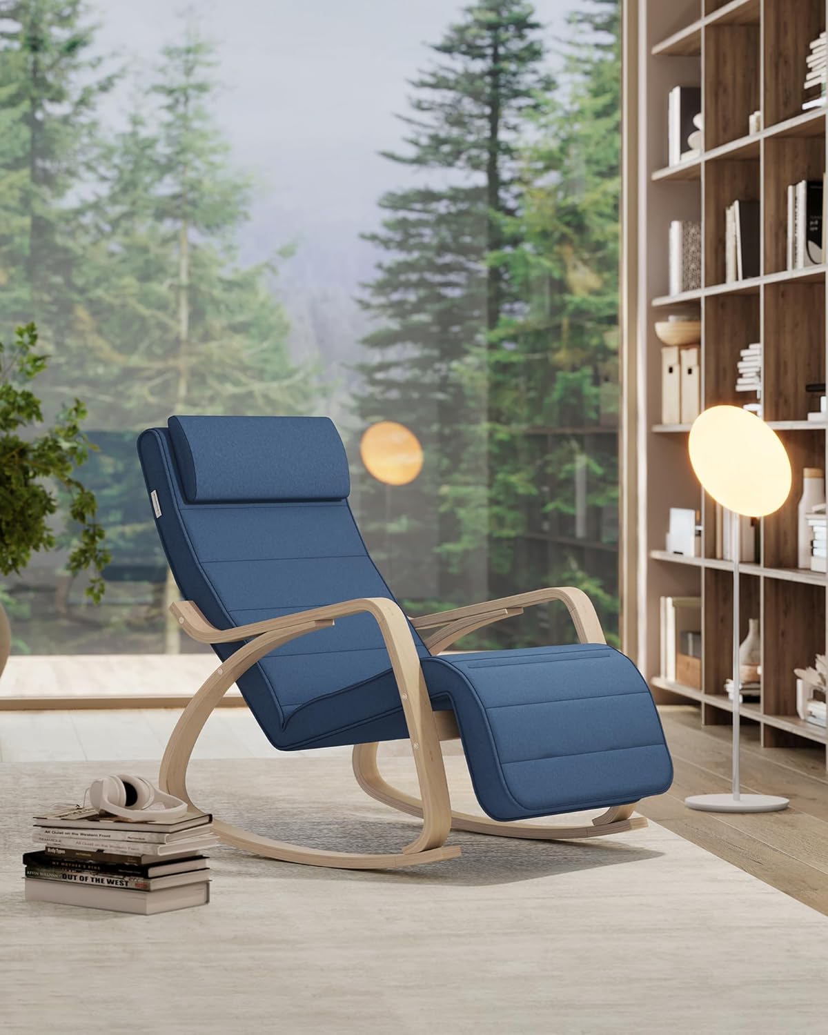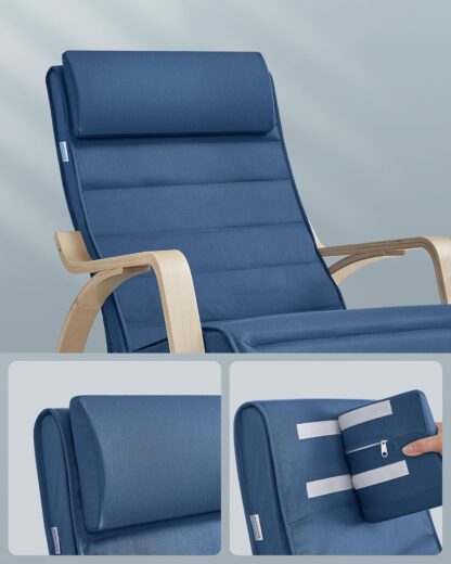 ONGMICS LYY010Q01 LYY010Q01 Schommelstoel – relaxstoel – relax fauteuil – met armleuningen – van berkenhout – 5-voudig verstelbare voetensteun- blauw / houtkleurig – LYY010Q01