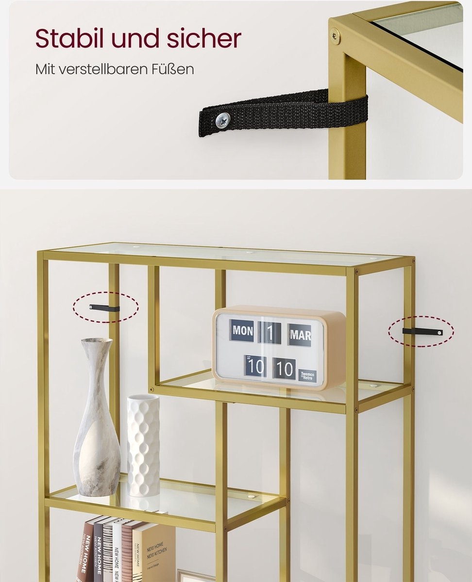 Met zijn metallic gouden afwerking en transparante planken biedt deze unit een chique manier om uw boeken, verzamelobjecten of foto’s te tonen. Het verbetert de esthetiek van de kamer terwijl uw items netjes georganiseerd blijven.