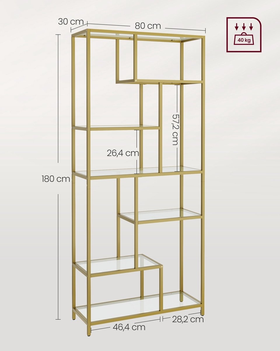 Openkast – opbergkast – boekenkast – hoogte 180 cm – glas met metaal – goudkleurig – LGT502A01