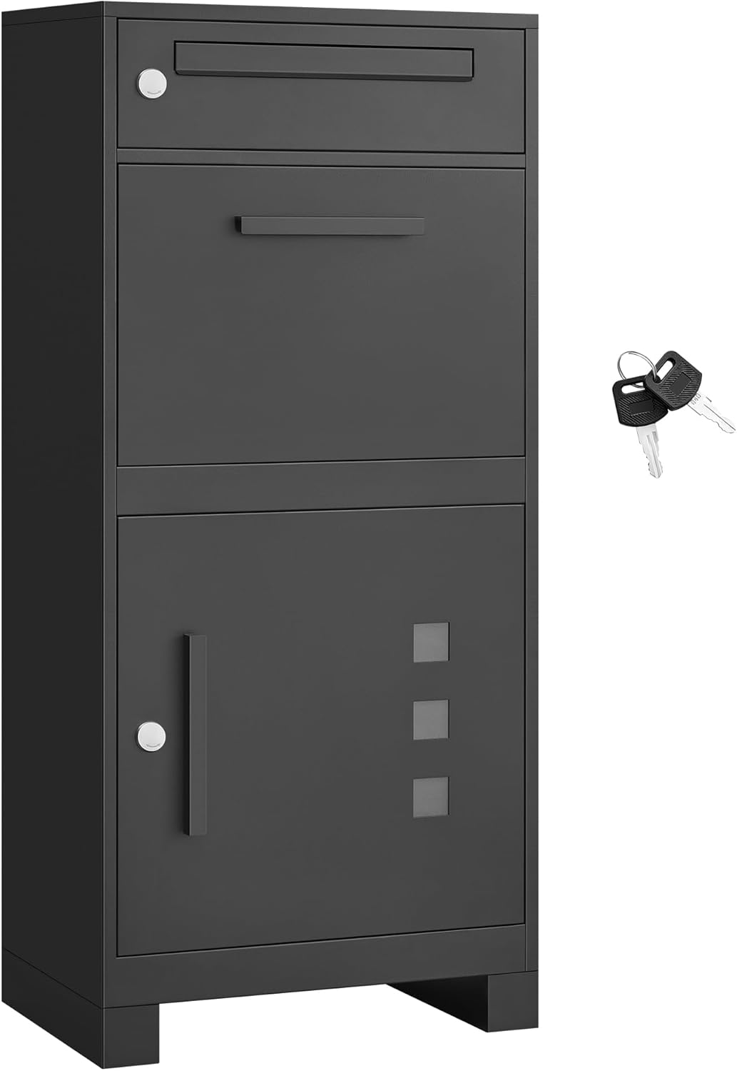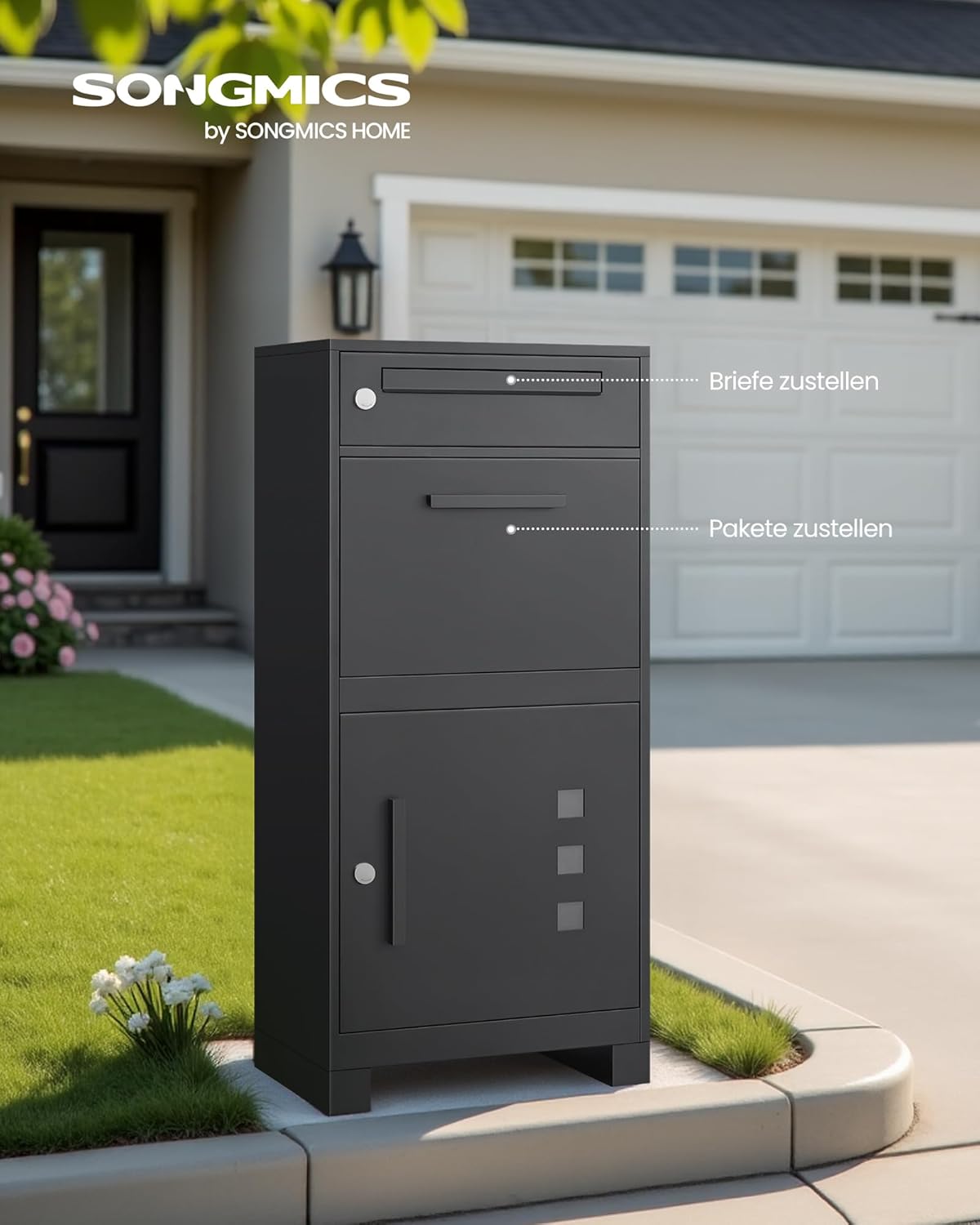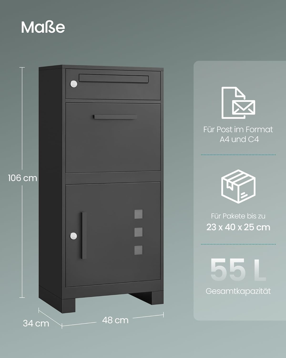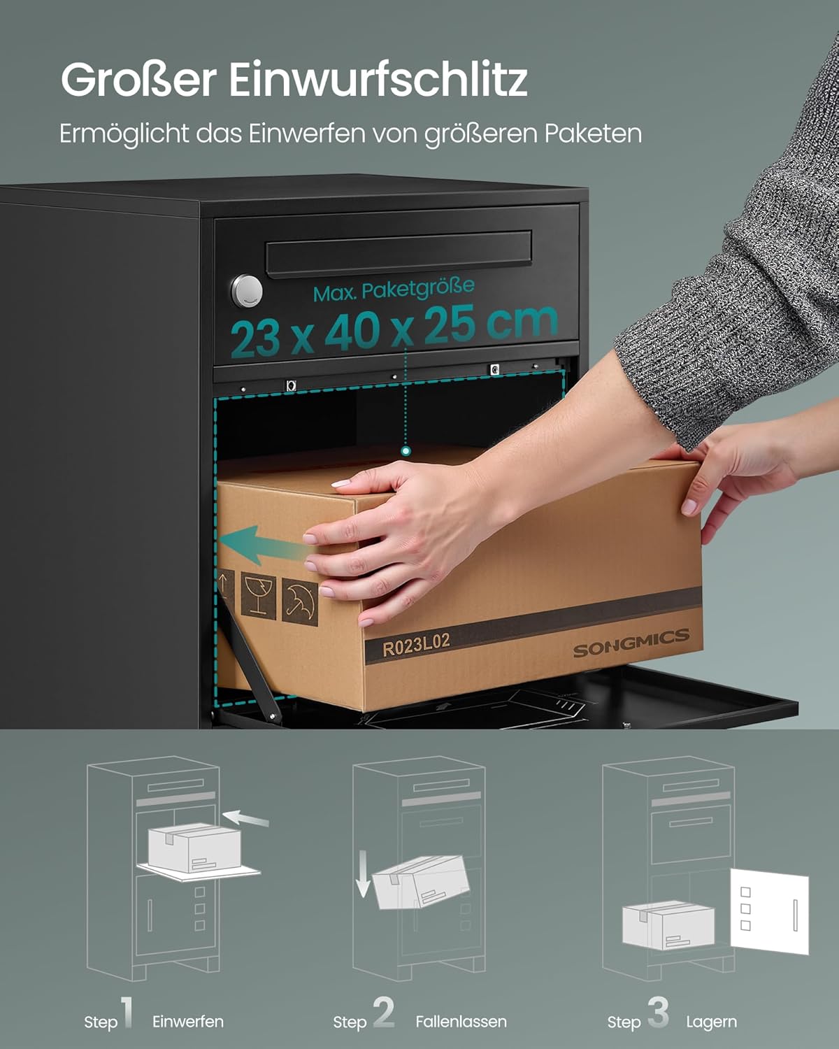 Ruime opbergruimte voor uw pakketten: Met een indrukwekkende inhoud van 55 liter biedt deze pakketbrievenbus volop ruimte voor uw post. De brievenbus kan tot 90 graden volledig worden geopend, zodat u uw pakketten moeiteloos kunt inwerpen.
