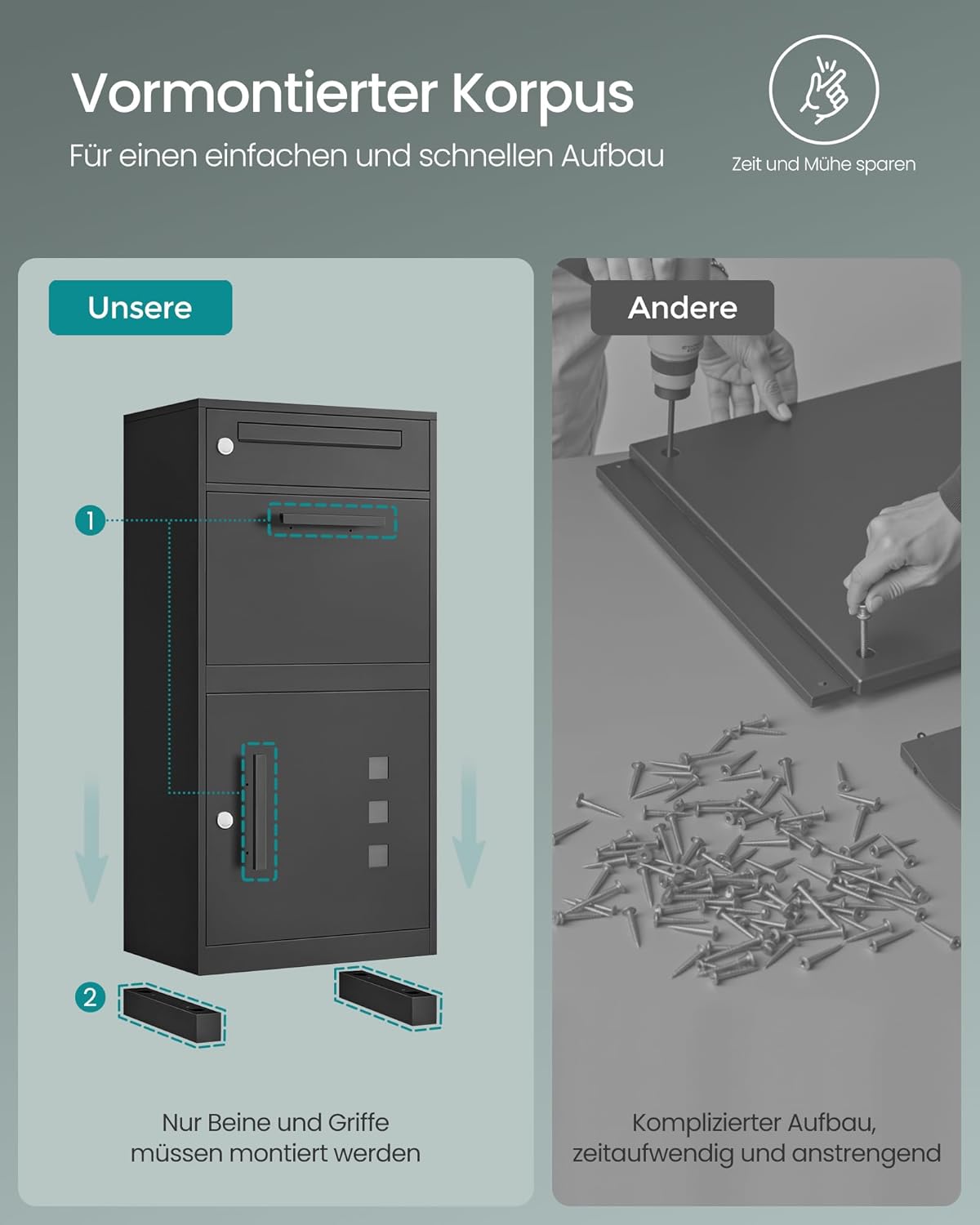 Snelle montage, klaar voor gebruik: Snel en eenvoudig te monteren! Dankzij de voorgemonteerde behuizing hoeft u alleen nog maar de voetjes en handgrepen te bevestigen. Uw pakketbrievenbus met brievenvak is direct klaar voor gebruik, waardoor u kostbare tijd en moeite bespaart.