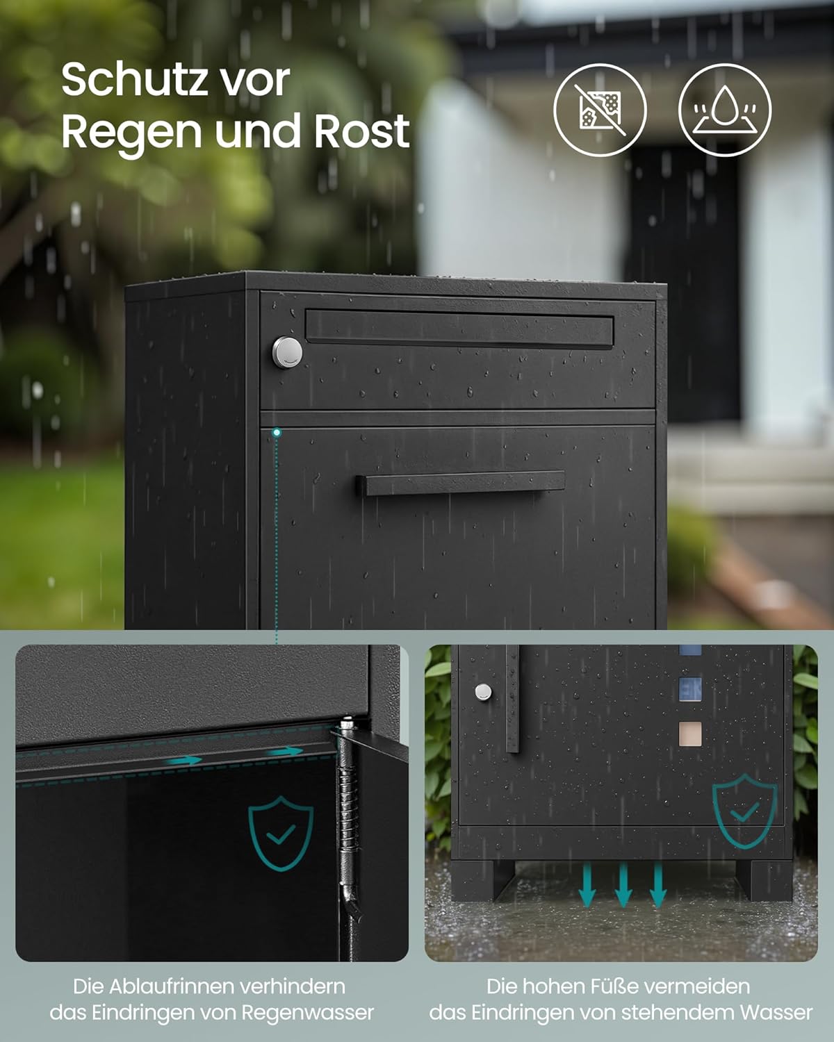 Water- en roestbestendig: beschermd door het deksel is het slot water- en roestbestendig; de afvoerkanalen, de schuin aflopende bodemplaat van de pakketbus en de hoge voetjes voorkomen dat er water in komt en beschermen zo uw waardevolle spullen.