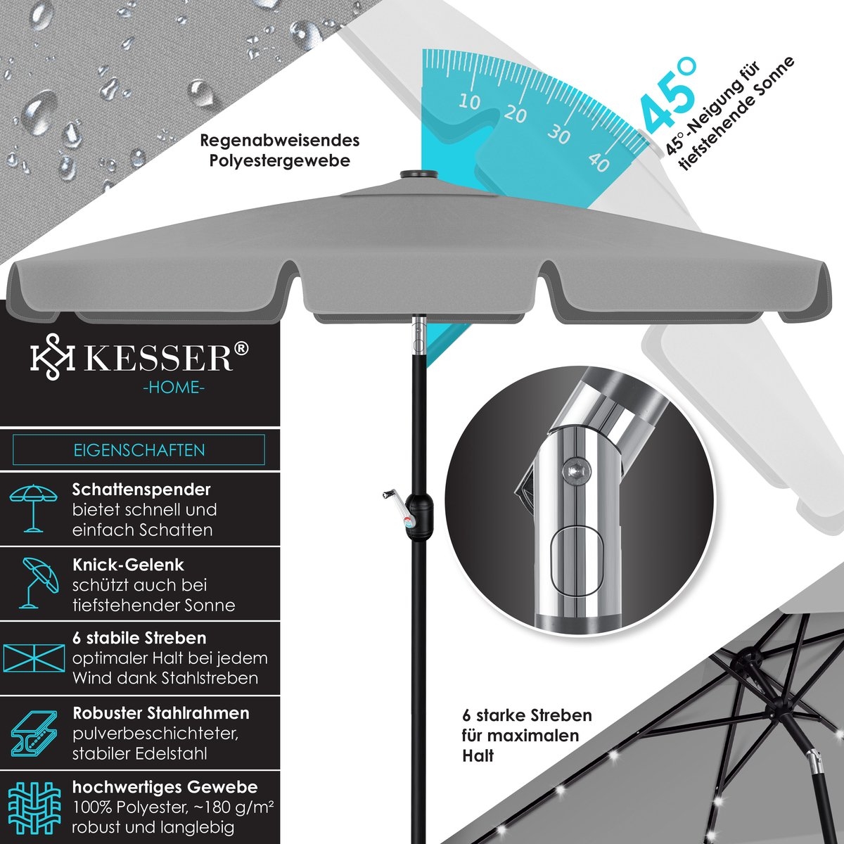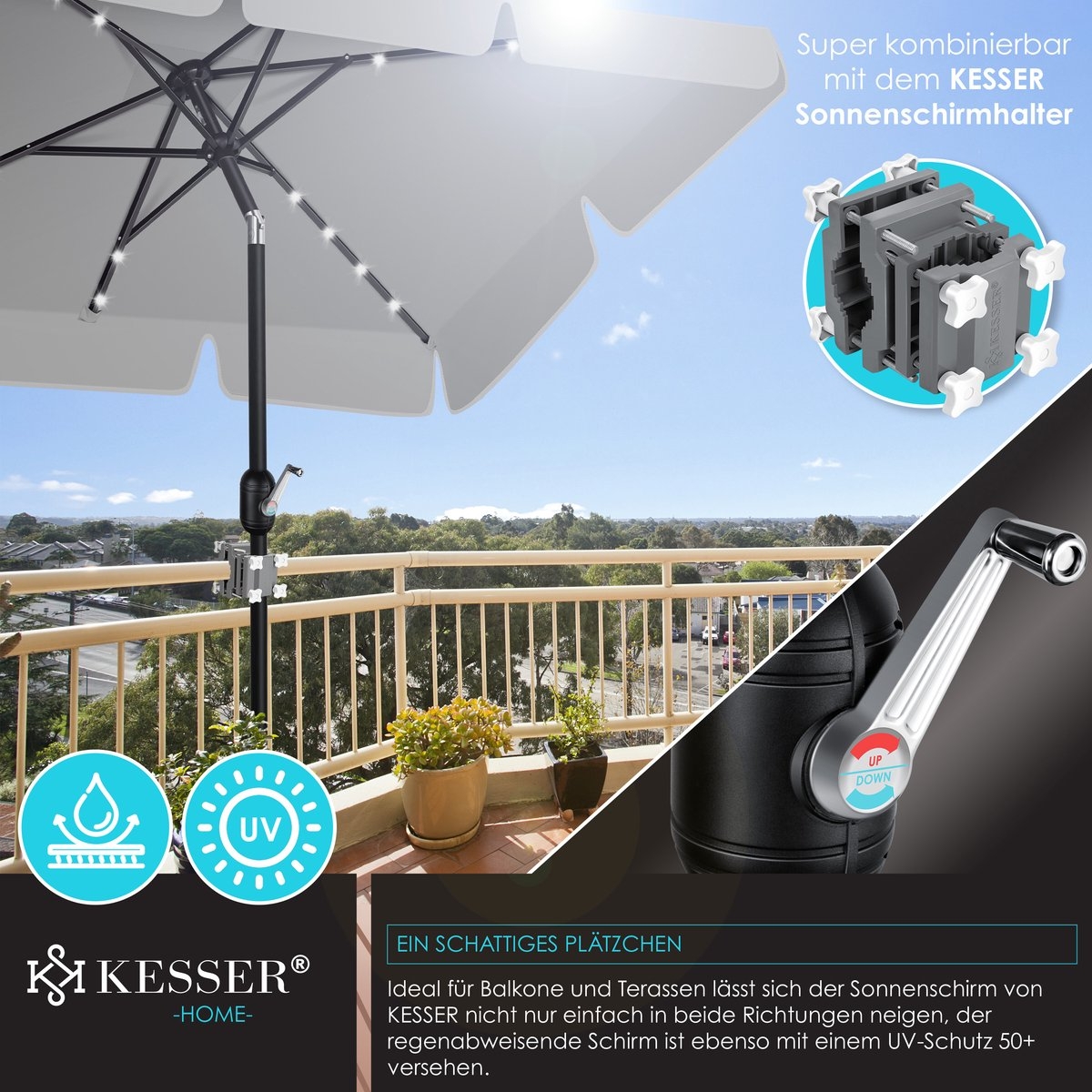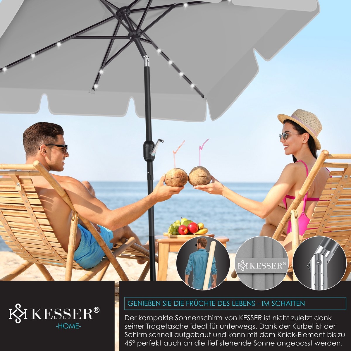 HANDBAND EN DRAAGBOUG: De KESSER parasol wordt geleverd met een 2in1 hoes & praktische tas voor onderweg.Hierdoor is de parasol beschermd tegen stof en vuil en kan hij gemakkelijk worden vervoerd.Met de praktische handslinger is de parasol gemakkelijk op te zetten en af te breken en kan hij snel worden geopend en gesloten.Op het terras, balkon of in de tuin – met de KESSER parasol ben je perfect uitgerust.