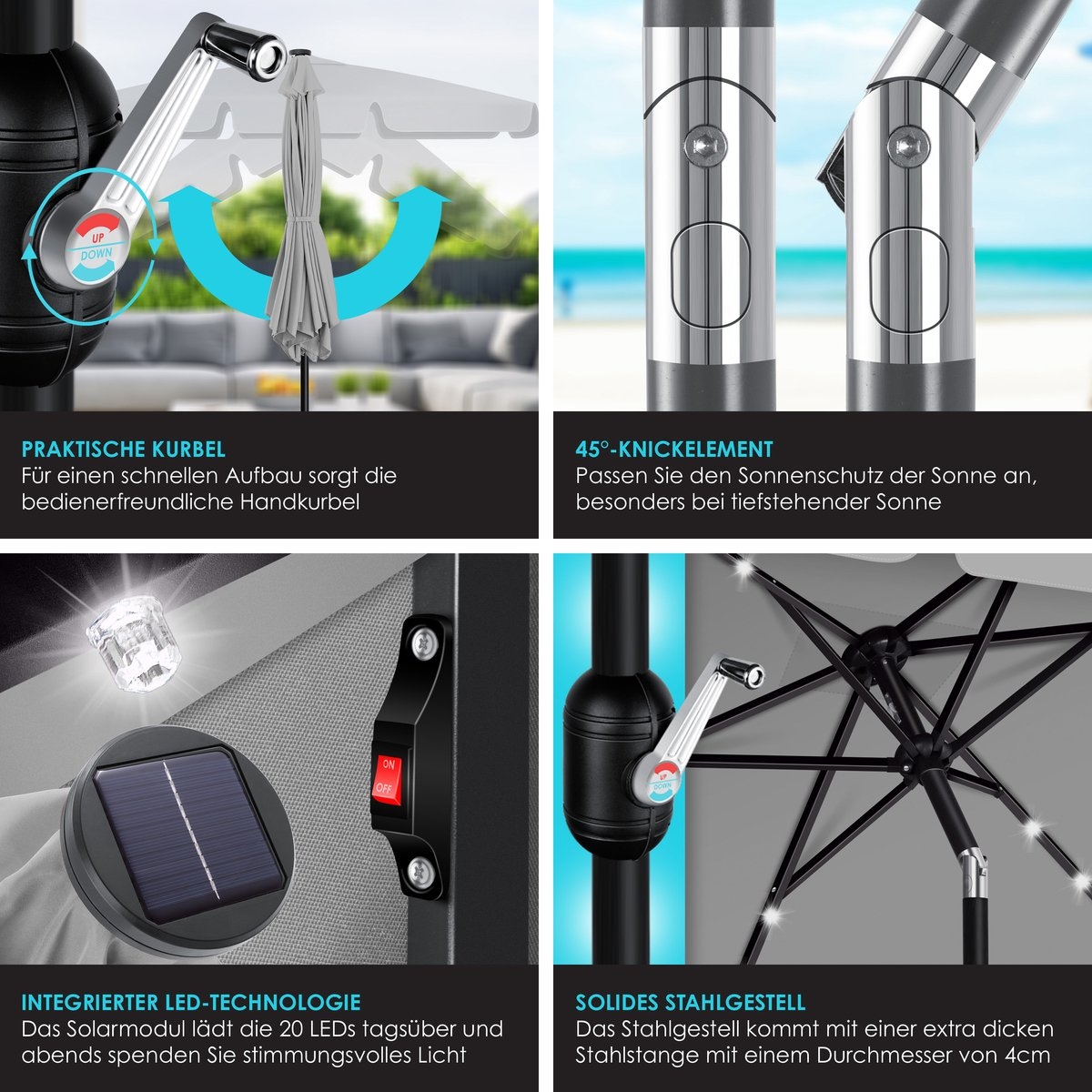 Parasol LED met geïntegreerde knikverbinding voor ideale schaduw, stabiele roestvrijstalen en robuuste steunen, water- en UV-bescherming, opladen met daglicht dankzij geïntegreerde zonnemodule, incl. 2in1 hoes & tas