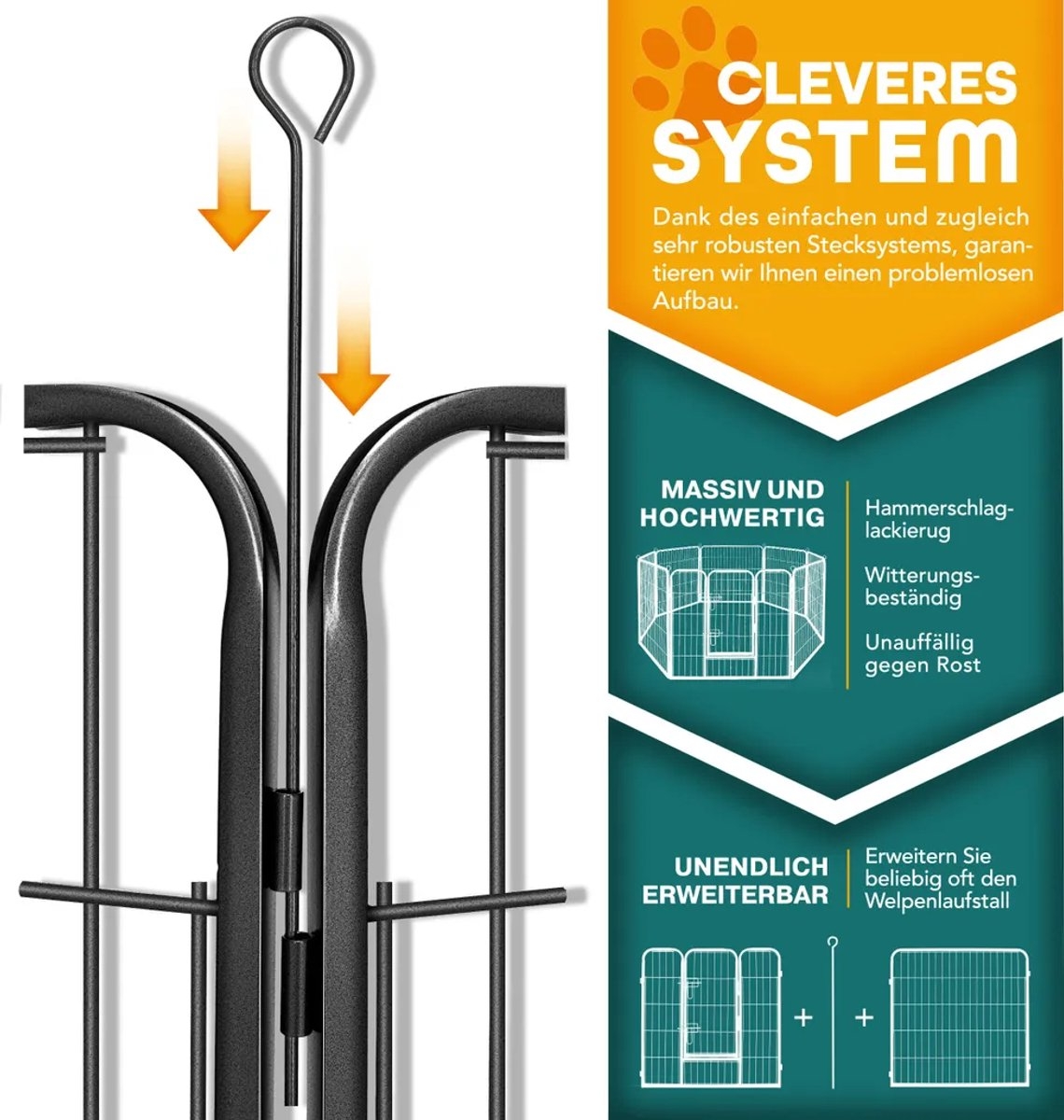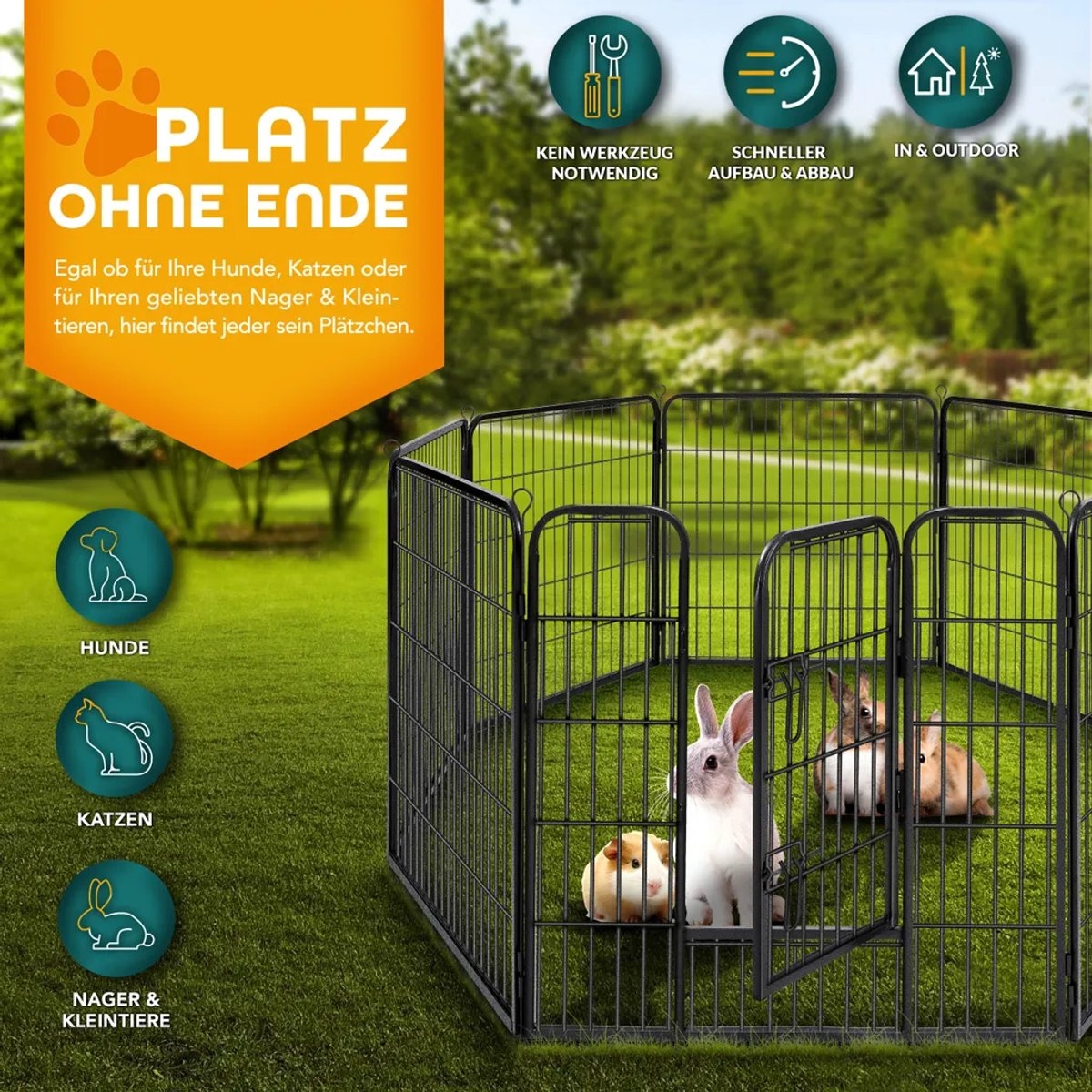 De puppyren is snel in slechts 5 minuten te monteren dankzij een eenvoudig plug-in systeem met grondankers (diameter 4 mm). Insteekdiepte: tot 11,5 cm. De puppyren is geschikt voor honden, katten, puppy’s, konijnen, cavia’s of andere kleine dieren en knaagdieren. Veilig in gebruik dankzij afgeronde randen en BPA-vrij materiaal.