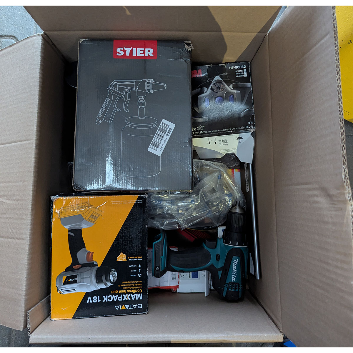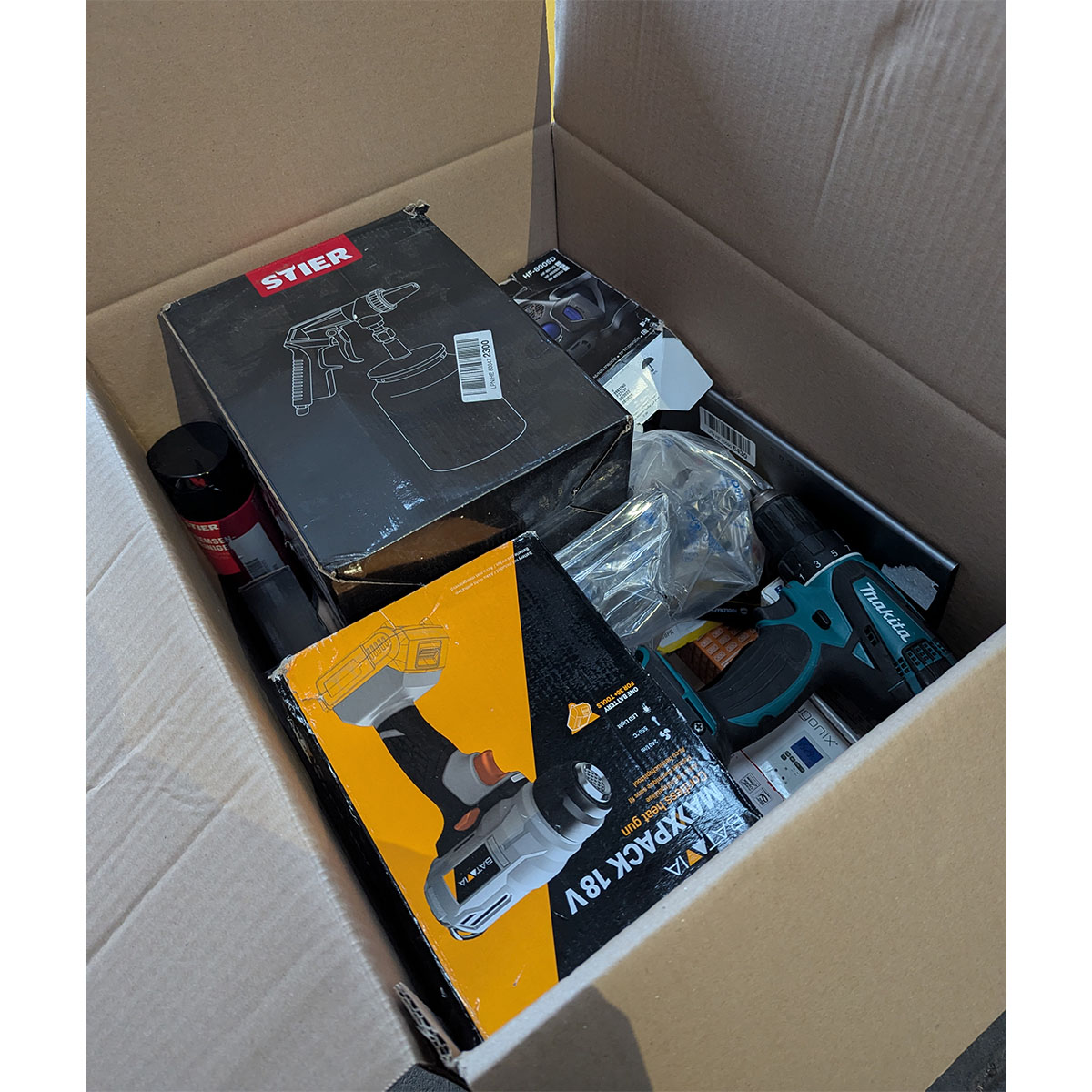 Retourbox met voornamelijk garage- / werkplaatsartikelen en gereedschap. Deze box bevat ongecontroleerde retourartikelen.