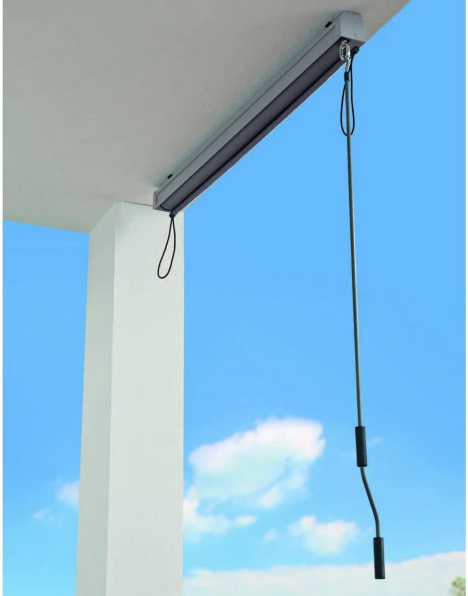 - Verticale luifel voor balkons en terrassen – De luifel is eenvoudig te installeren aan het plafond en kan handmatig op de juiste lengte worden ingesteld met behulp van een zwengel. De luifel kan tot ca. 2,40 m verlengd worden (max. lengte 250 cm met cassette, breedte 140 cm).