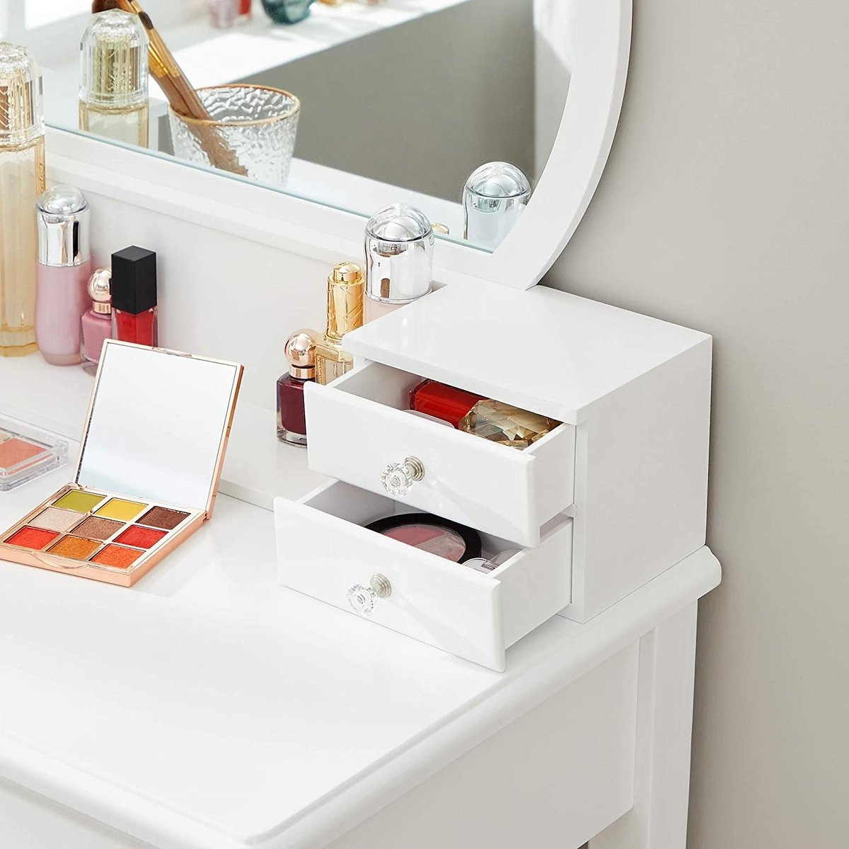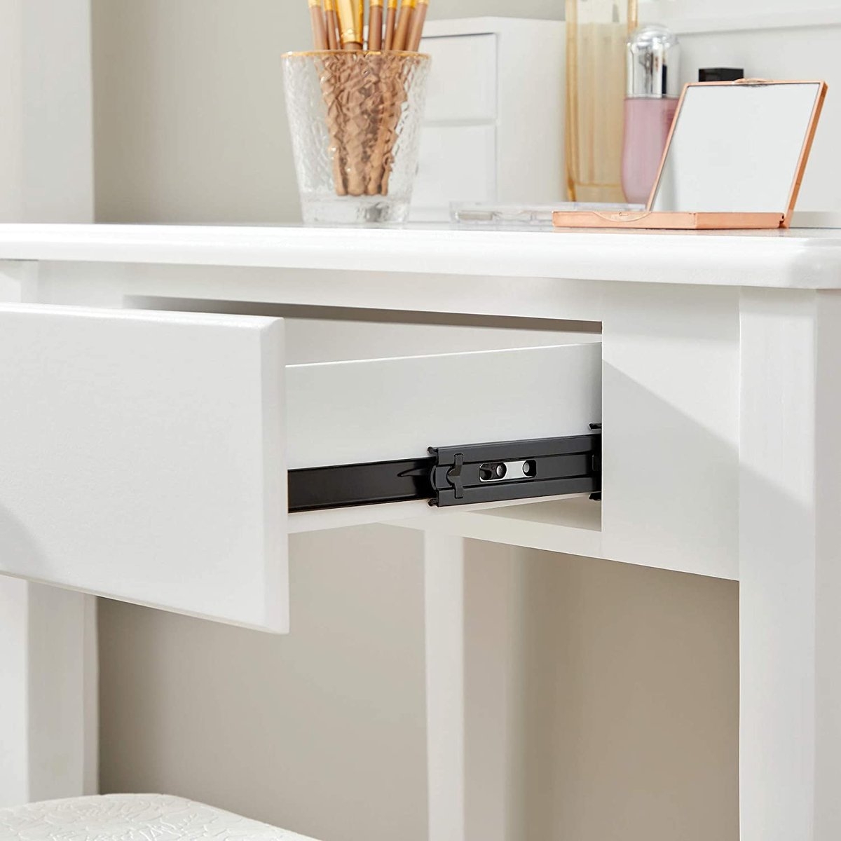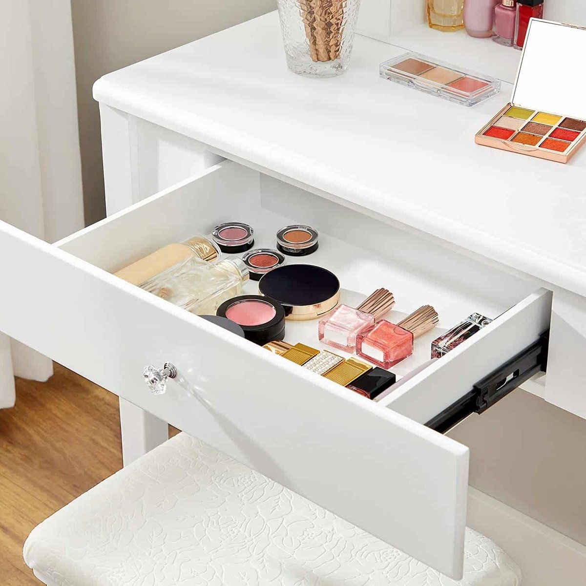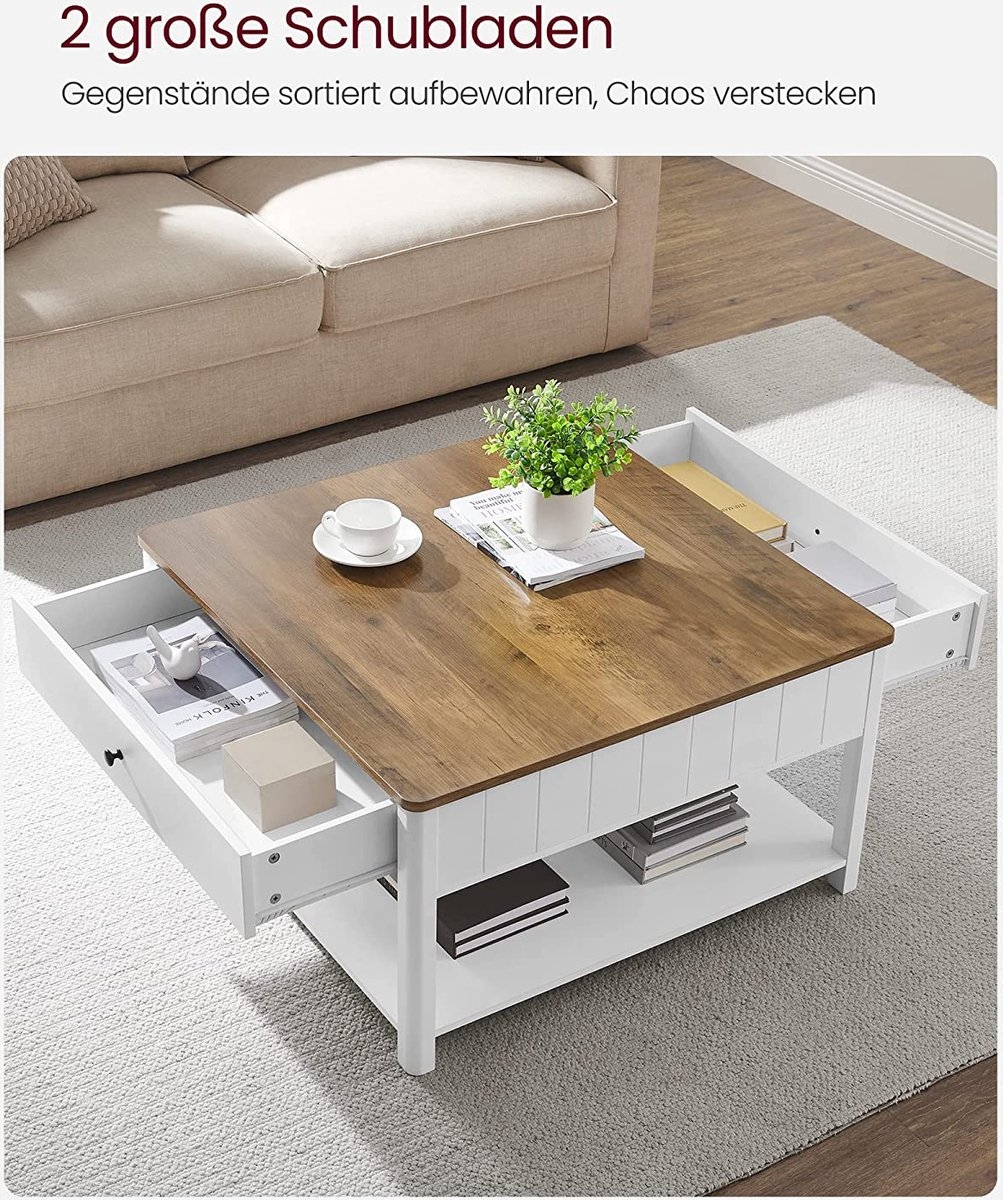 Veel opbergmogelijkheden: een tafelblad van 80 x 80 cm voor je bloemenvaas of decoratie, 2 grote lades voor koptelefoons, gamecontrollers, afstandsbedieningen, enz., en een open plank voor boeken of manden.