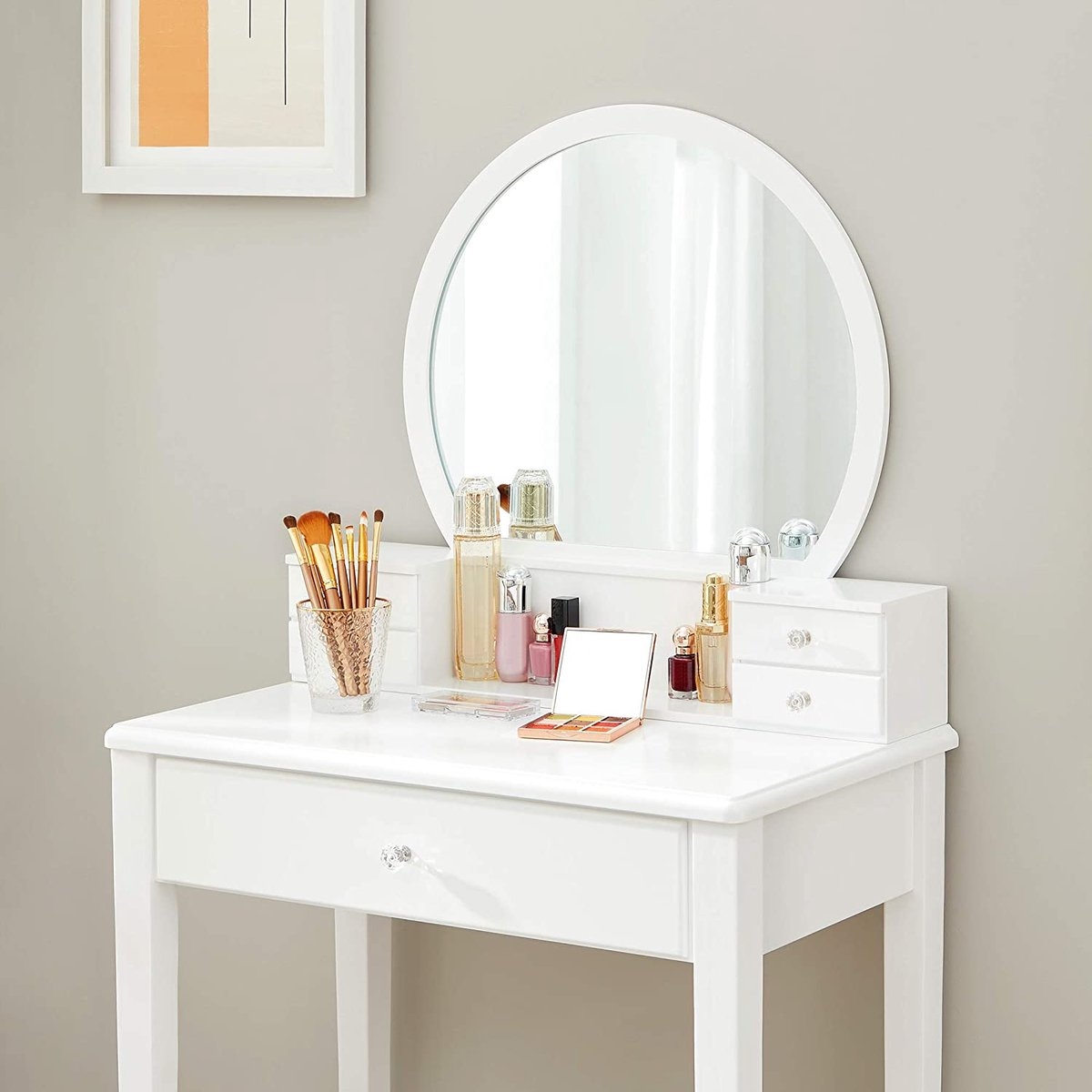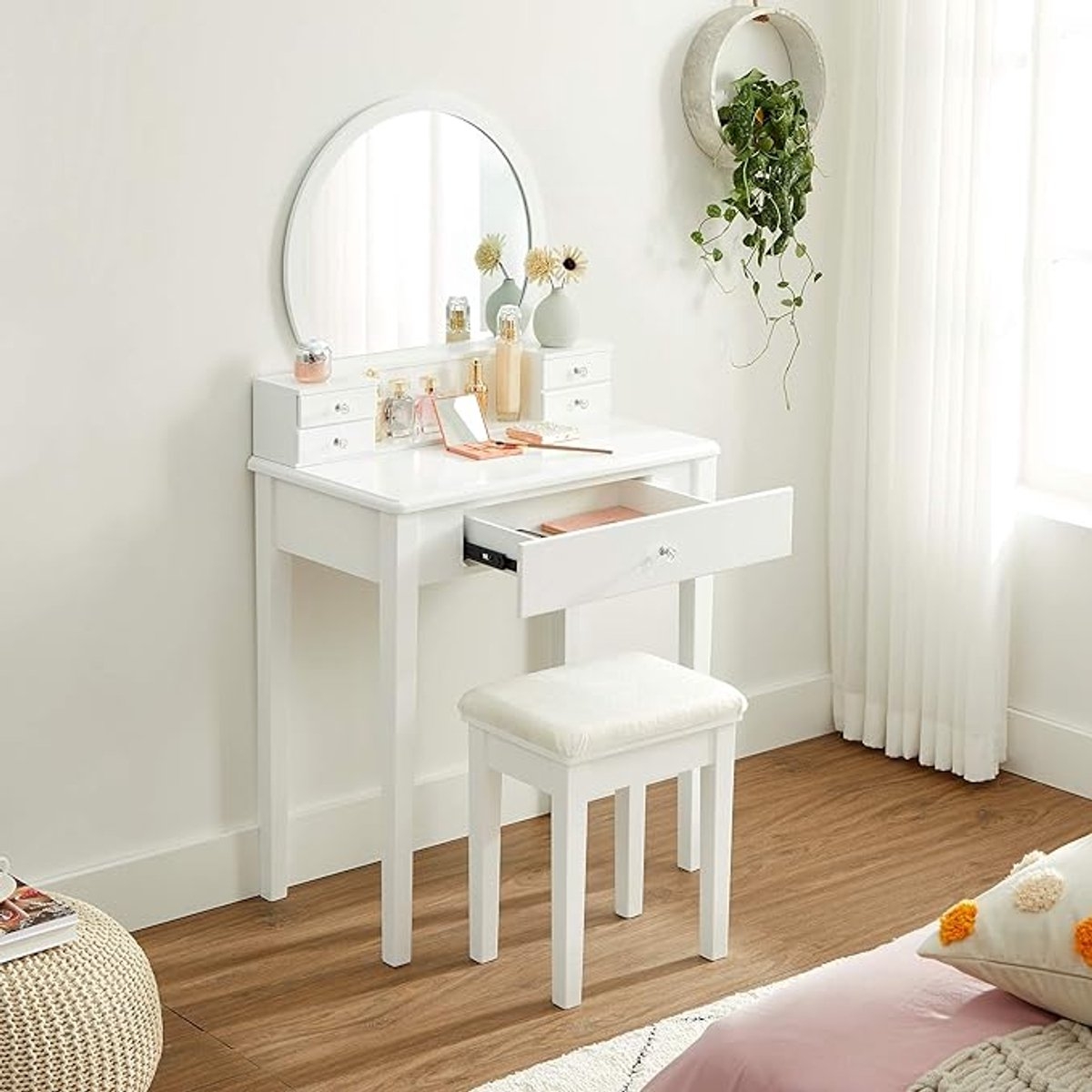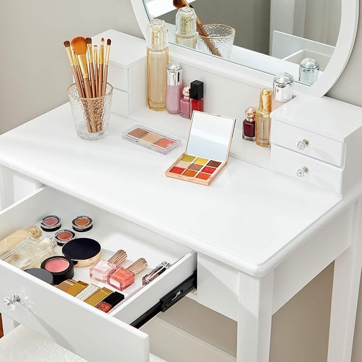 Veel opbergmogelijkheden: een tafelblad van 80 x 80 cm voor je bloemenvaas of decoratie, 2 grote lades voor koptelefoons, gamecontrollers, afstandsbedieningen, enz., en een open plank voor boeken of manden.