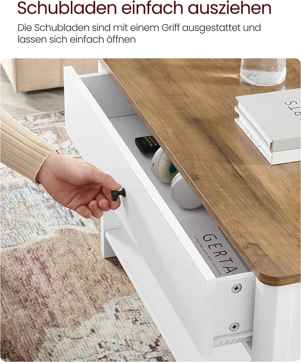 Kleurencombinatie van walnootbruin en wit, zwarte metalen handgrepen, strakke lijnen – deze salontafel brengt een frisse wind in je huis en geeft het tegelijkertijd een decoratief tintje.