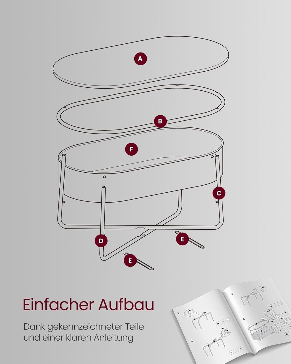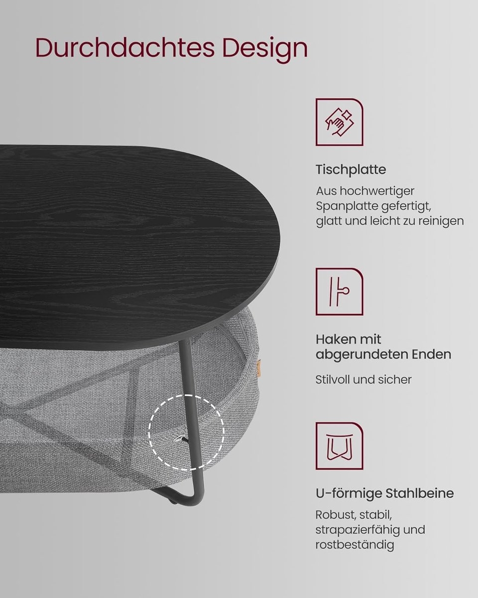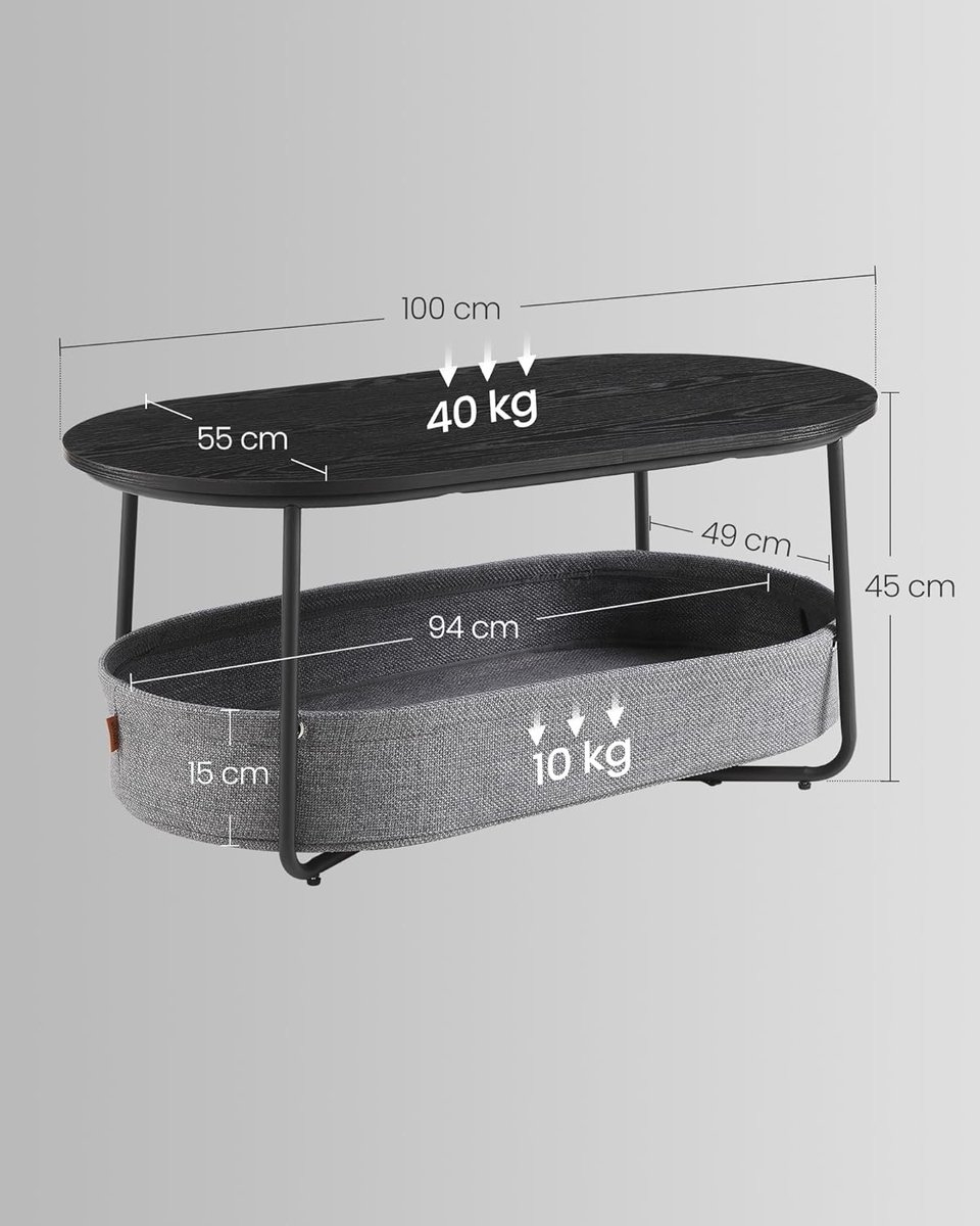 Deze moderne ronde salontafel met een lengte van 100 cm en een breedte van 45 cm is een perfecte aanvulling op uw interieur. Het eigentijdse design voegt een elegante touch toe die naadloos past bij diverse woonstijlen. De ruime mand van dubbellaags polyester biedt praktische opbergruimte voor dekens, kussens en boeken, terwijl de stevige spaanplaat en stalen U-poten voor stabiliteit zorgen. Dankzij de duidelijke instructies is de montage snel en eenvoudig, zodat u direct kunt genieten van het gemak en de stijlvolle charme van deze salontafel.