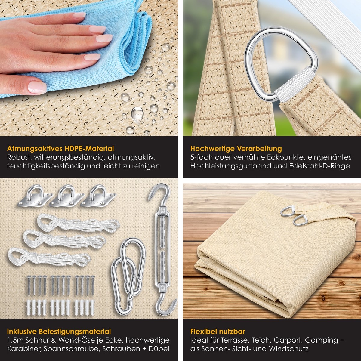 Creëer uw eigen paradijs in uw buitenruimte ! Omdat de zonneluifels 85% UV-bescherming bieden,weet u ook dat uw spelende kinderen goed beschermd zijntegen schadelijke straling .Het doek van HDPE (high-density polyethyleen) meteen materiaalgewicht van 185 g/m² is scheur- en weerbestendig. Het droogt ook snel, blijft schimmelbestendig en rotbestendig.