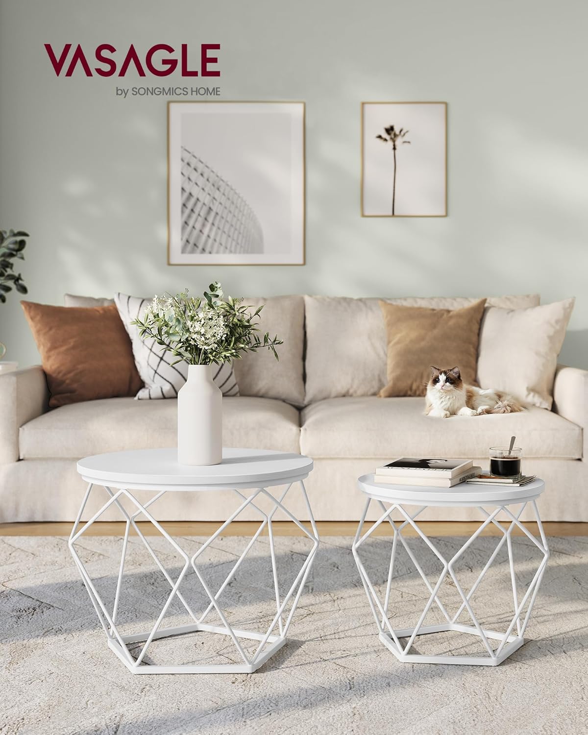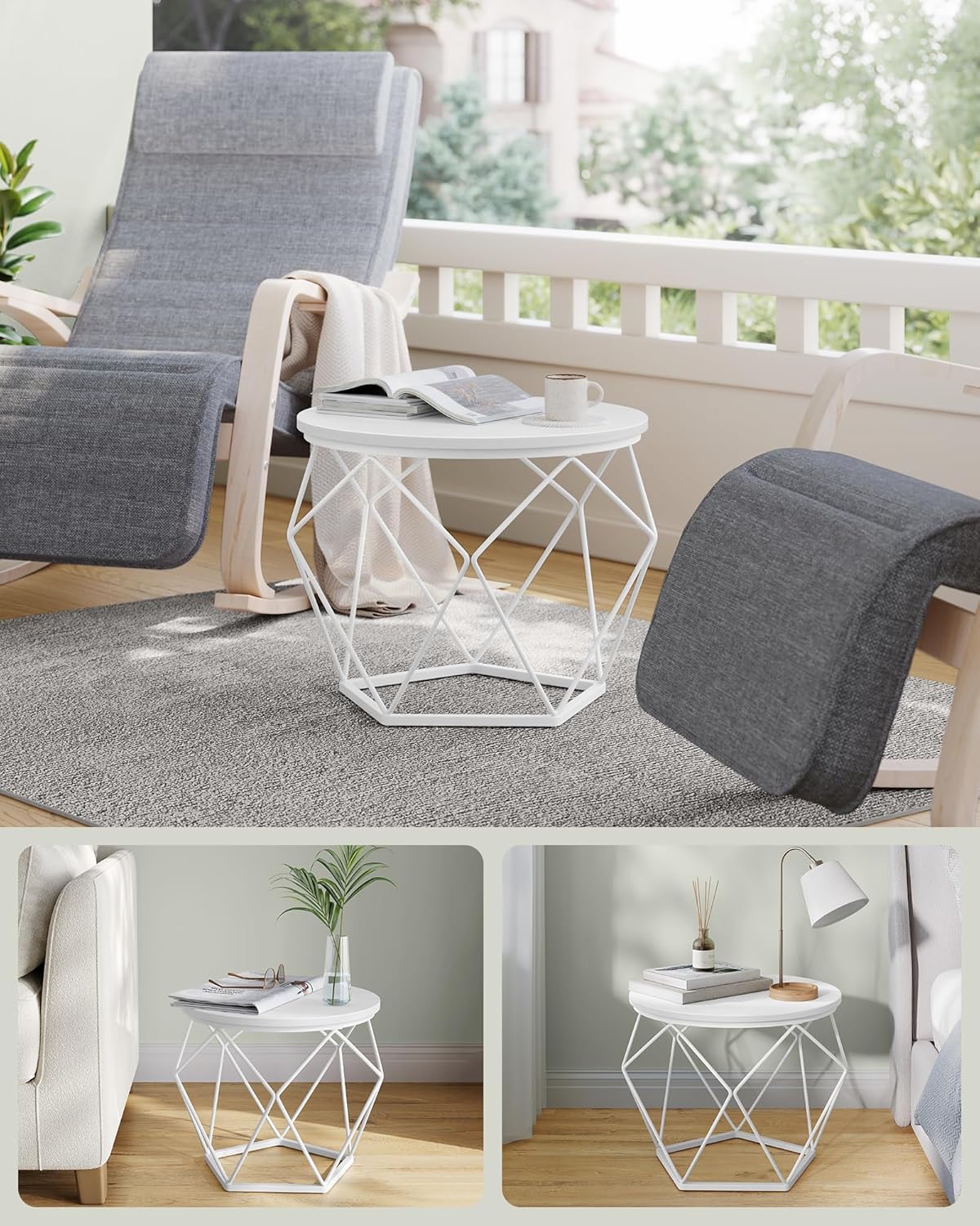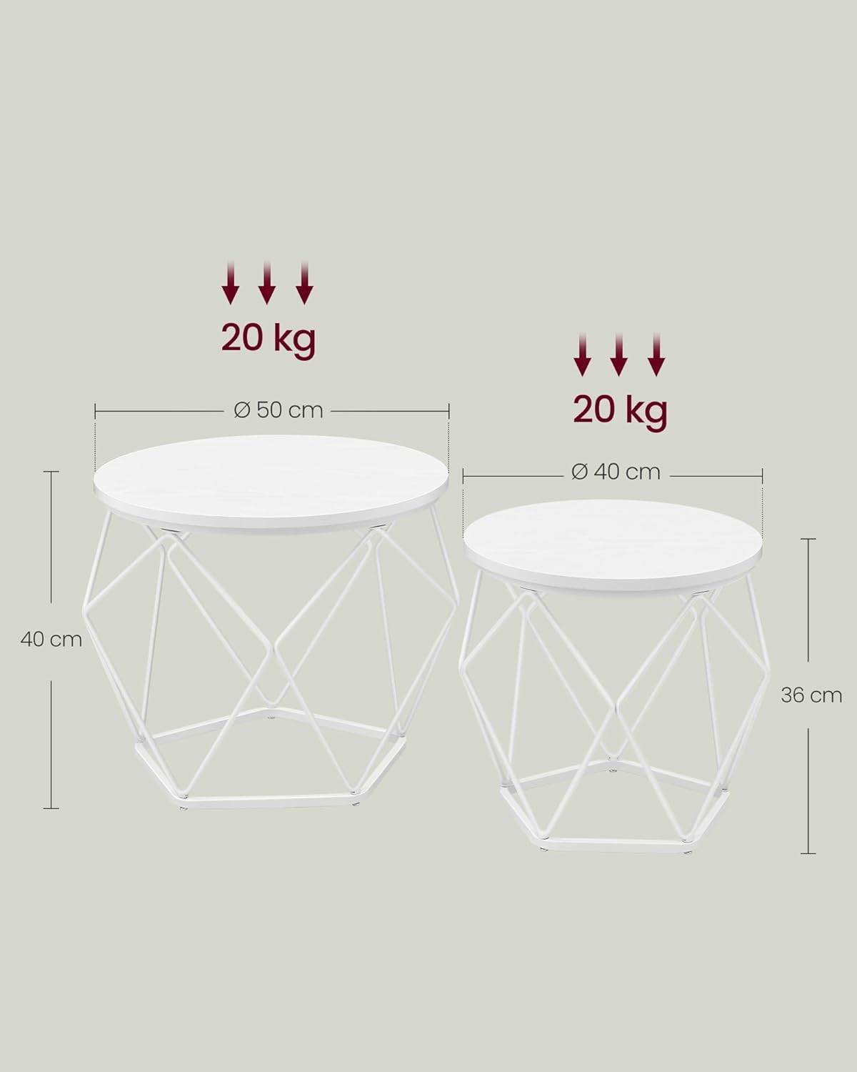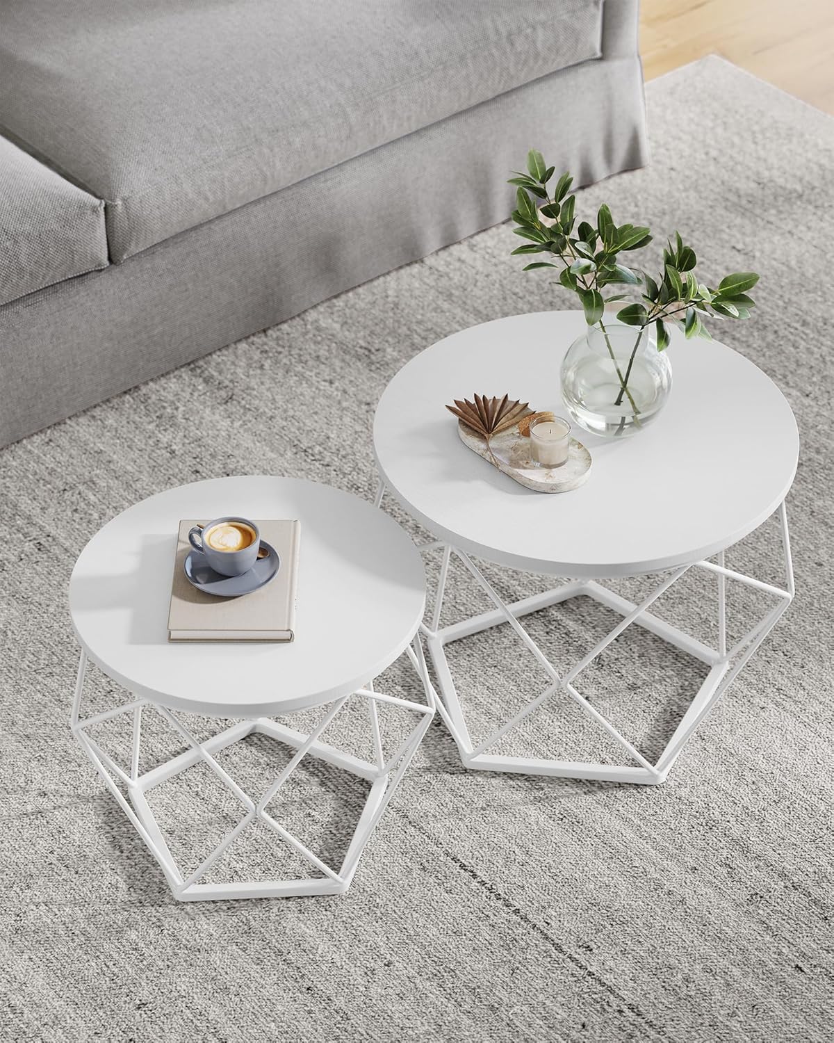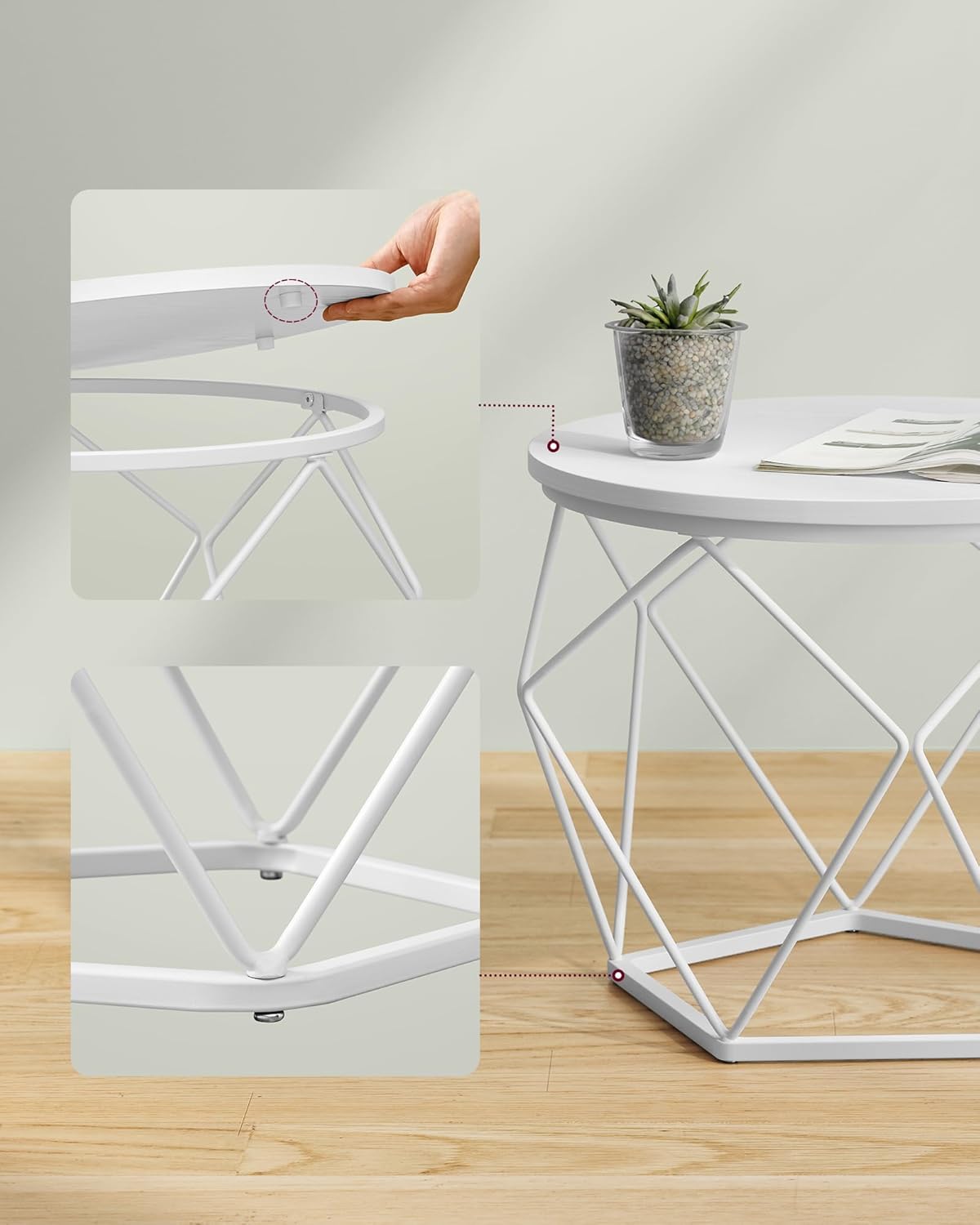 Samen of apart: gebruik de 2 bijzettafels samen voor een harmonieuze combinatie in de woonkamer om kamerplanten neer te zetten. Of gebruik ze los, één naast de bank en de andere in de slaapkamer. Moderne stijl: deze moderne salontafels voor uw woonkamer geven uw ruimte een bijzondere touch met ronde witte bladen en geometrische witte stalen onderstellen. Hun aantrekkelijke uiterlijk zal indruk maken op uw gasten.