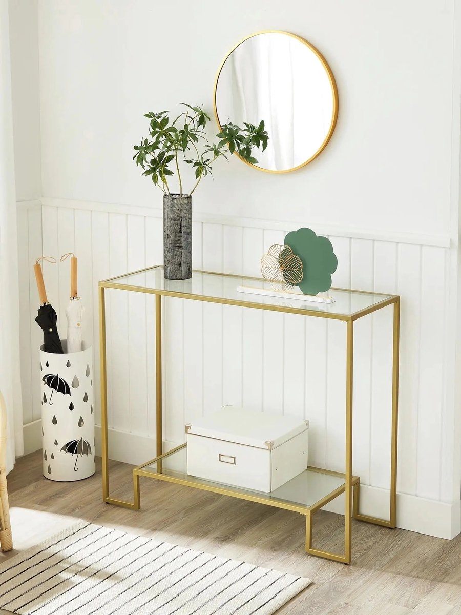De Vasagle Consoletafel met 2 Stations van Gehard Glas is ideaal voor smalle ruimtes zoals hallen, foyers of achter de bank. Met zijn strakke ontwerp en transparante glasplaten voegt deze tafel een moderne en verfijnde uitstraling toe aan je interieur.