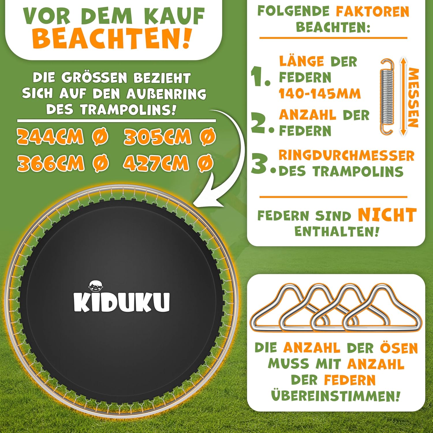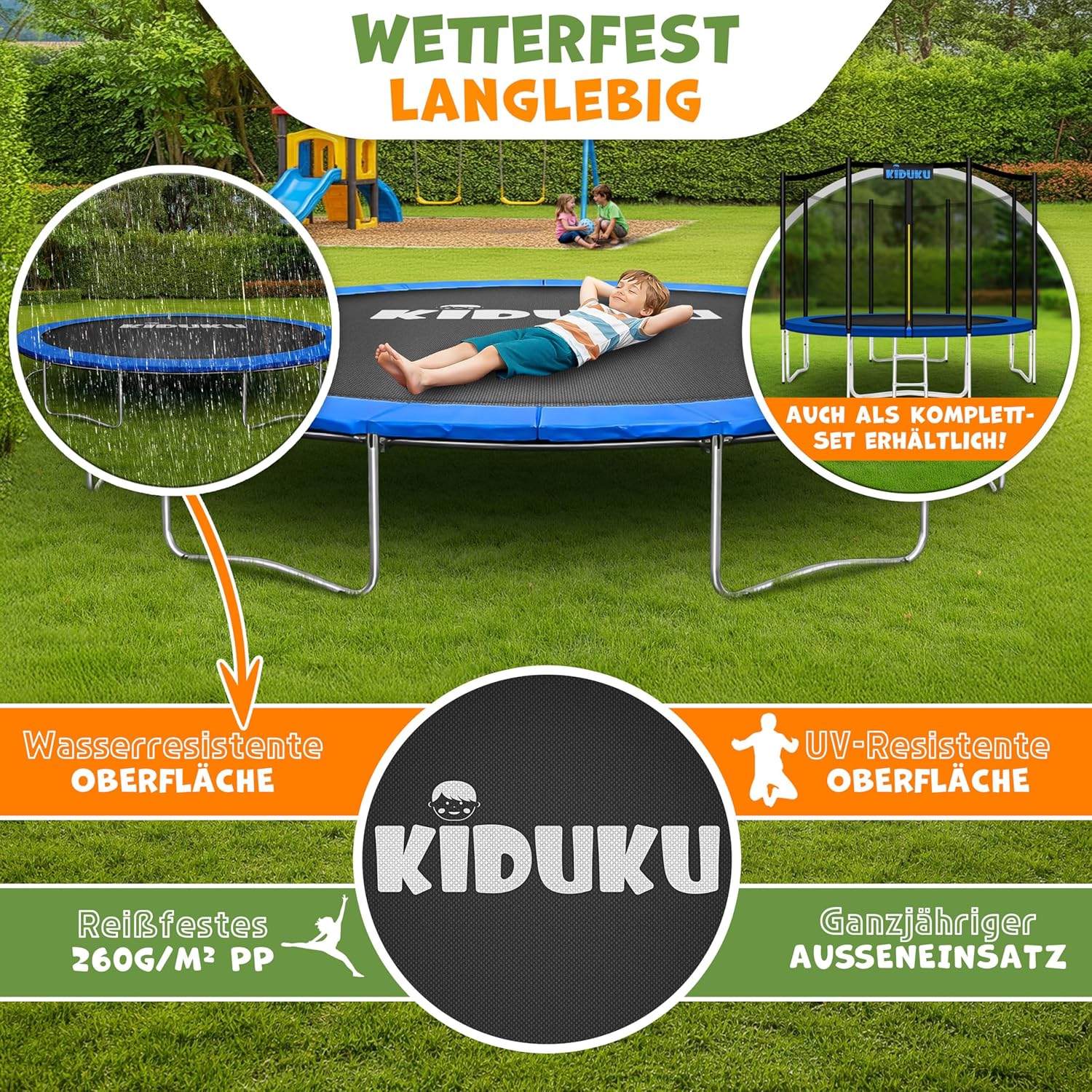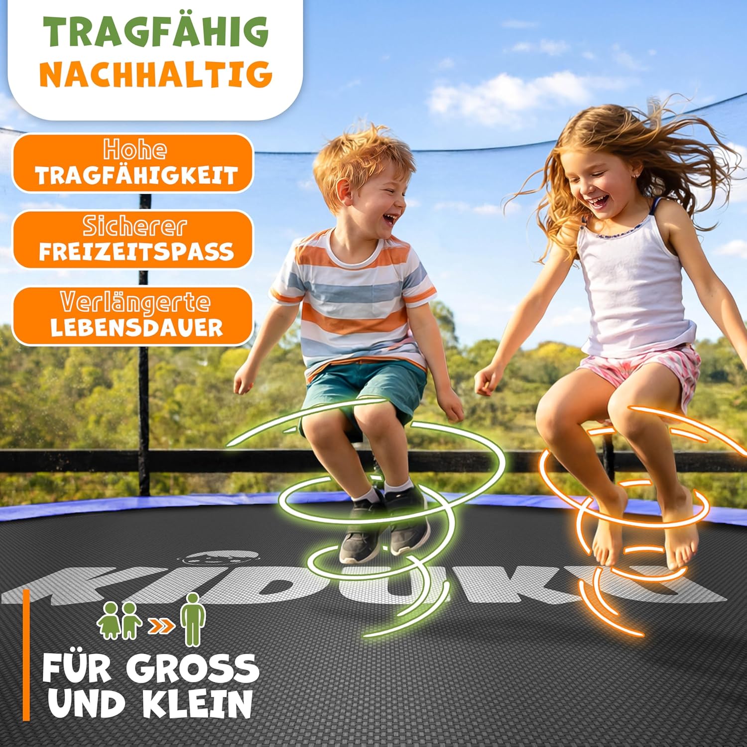 • Maximale scheurvastheid en veiligheid: de KIDUKU vervangende springmat bestaat uit extreem scheurbestendig 260 g/m² polypropyleen weefsel (PP). Voor maximale stabiliteit en een langere levensduur zijn de hoogwaardige D-ringen door een versterkte 8-voudige naad veilig bevestigd. Dit garandeert een veilig vrijetijdsplezier voor groot en klein en voorkomt dat de ogen scheuren zelfs bij een hoog draagvermogen.