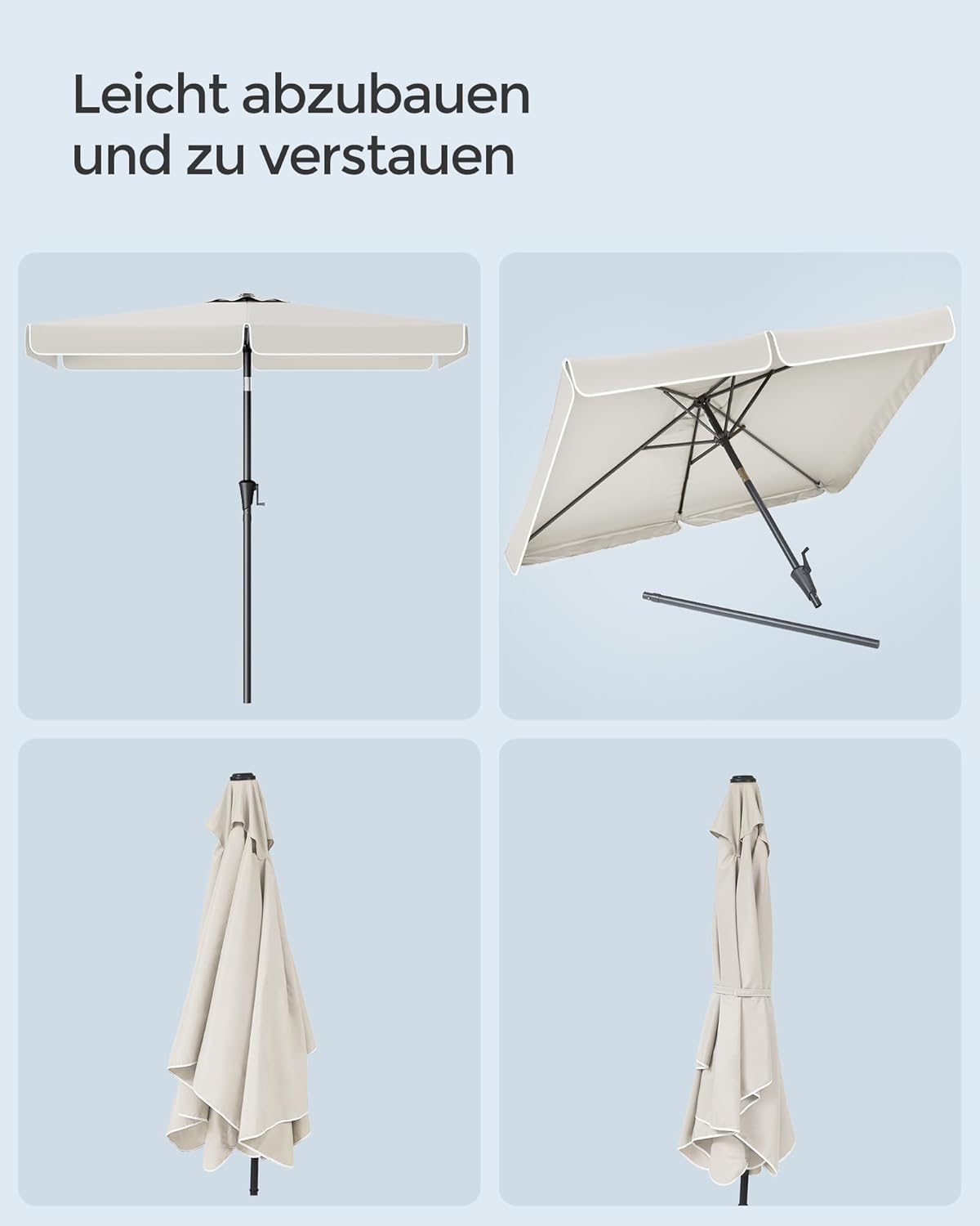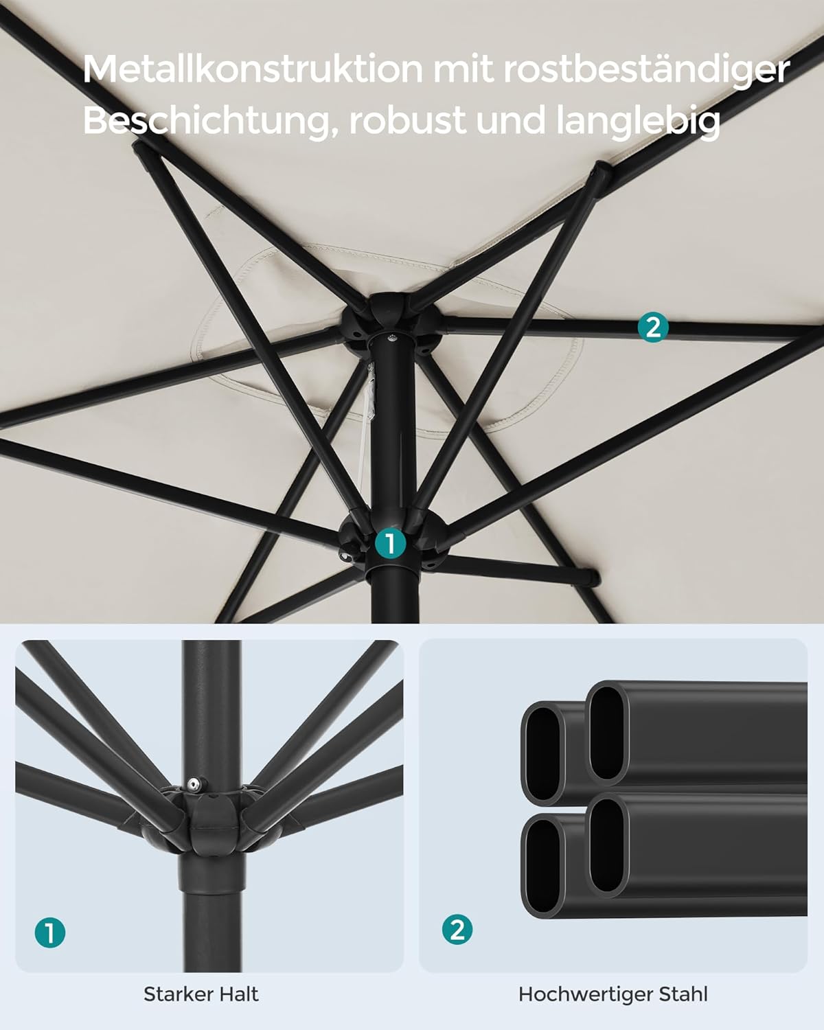 [Robuust en duurzaam] De 6 baleinen en de mast van de tuinparasol zijn gemaakt van hoogwaardig staal voor een robuuste constructie. Ze zijn bovendien gepoedercoat, wat een lange levensduur garandeert.