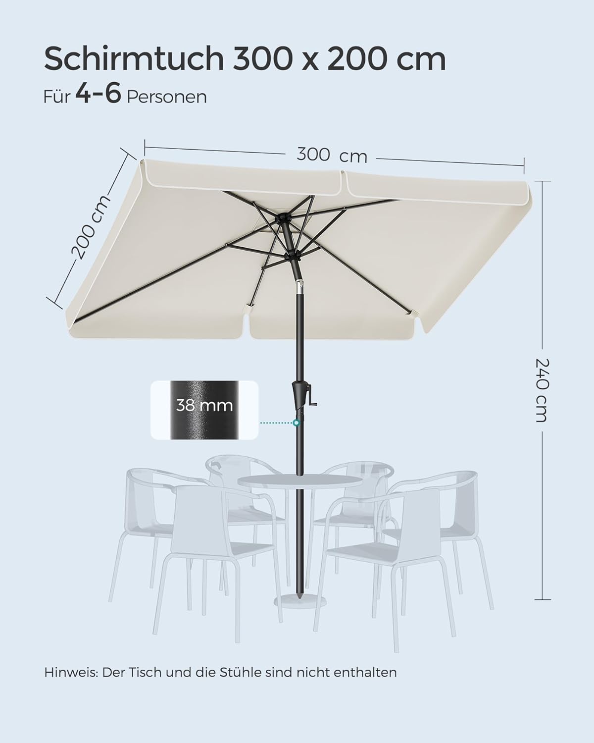 Perfecte pasvorm voor uw balkon: De rechthoekige parasol van 300 x 200 cm is ideaal voor uw balkon en biedt extra schaduw dankzij de speciaal ontworpen randen.