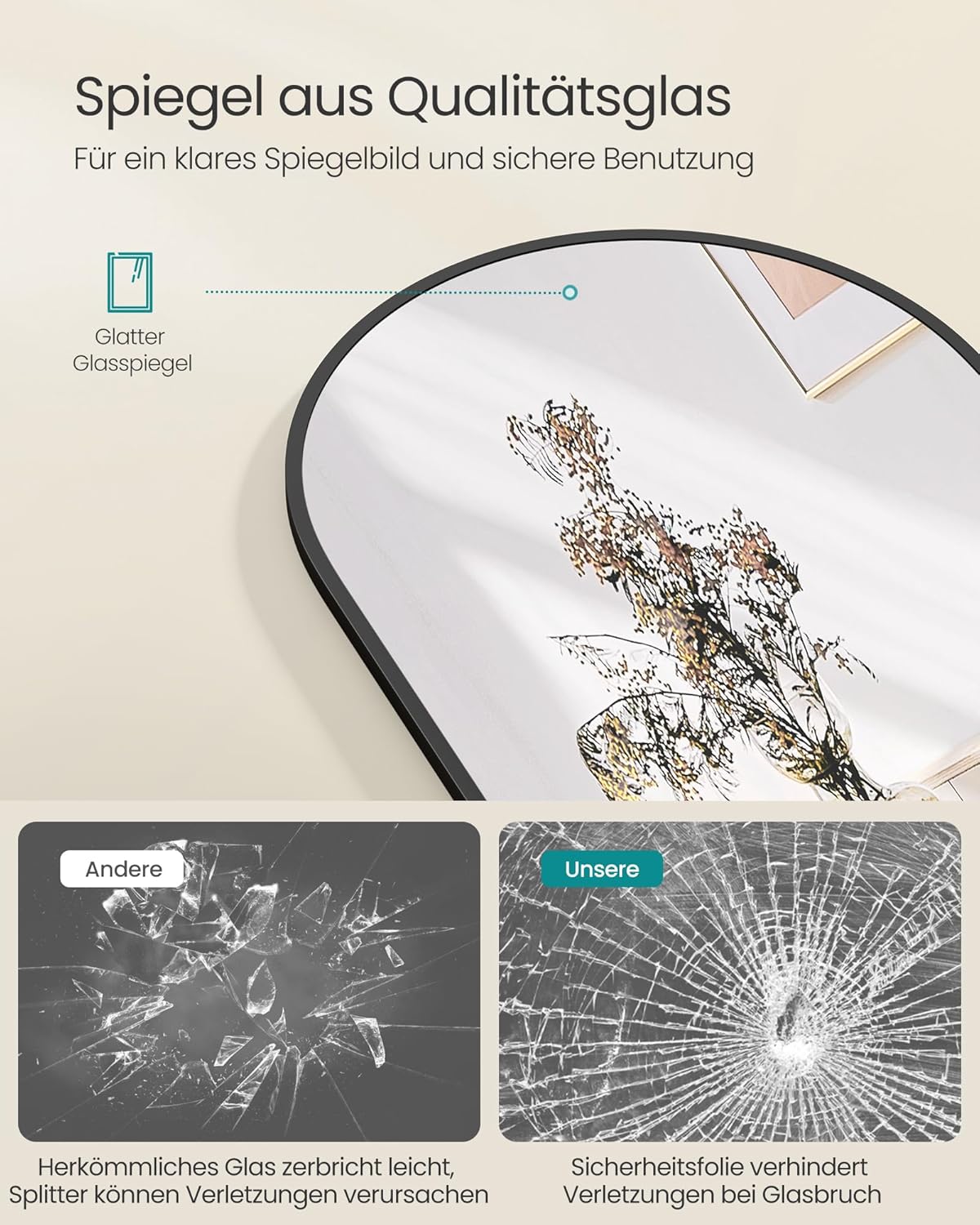 Sterk en veilig: gemaakt van hoogwaardig gehard glas met een veiligheidsfolie, is de staande spiegel breukvast en garandeert je veiligheid, zelfs in het zeldzame geval van breuk.