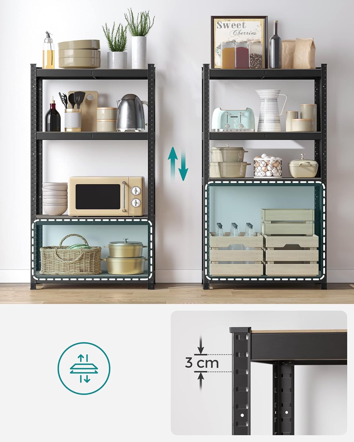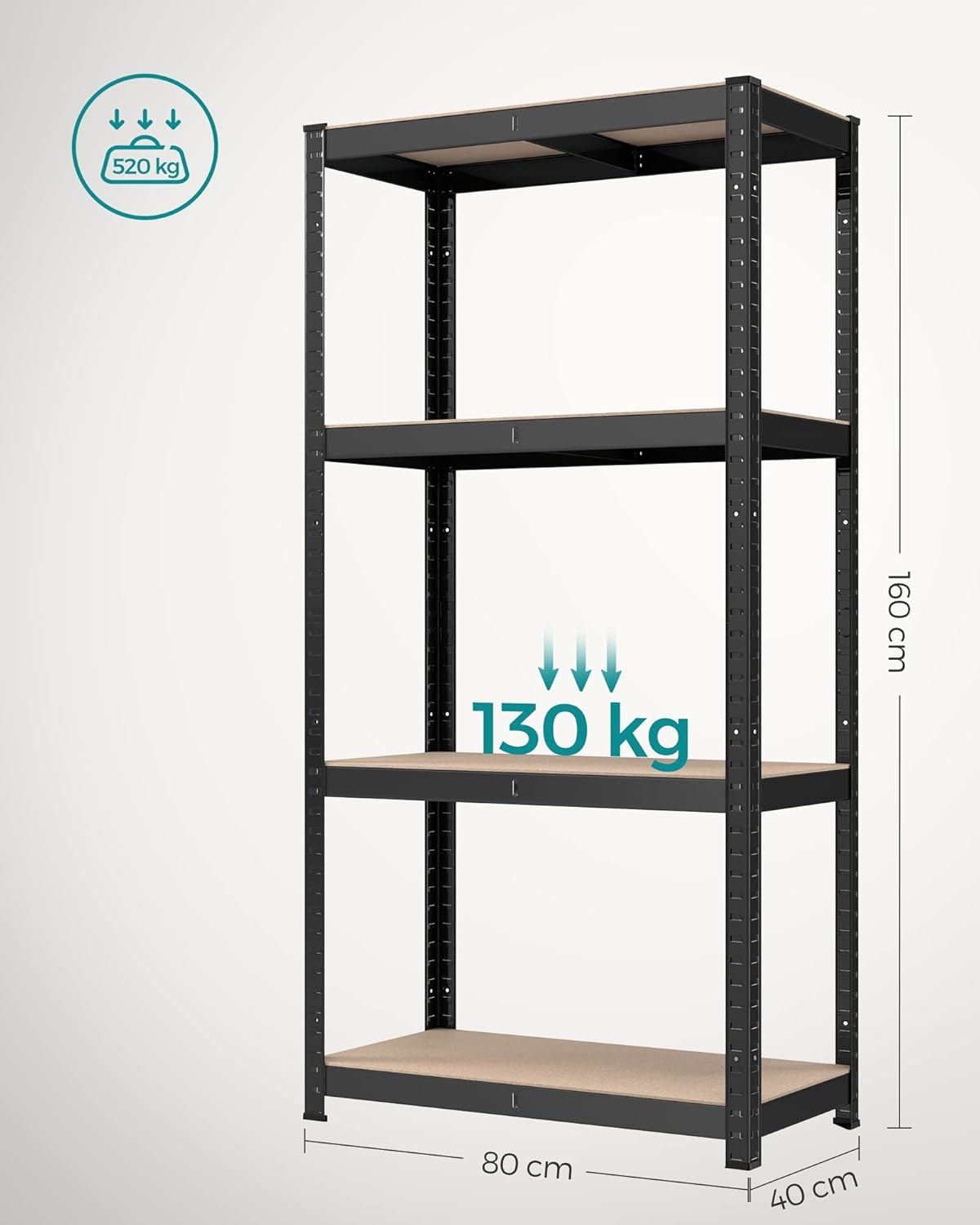 De stalen constructie en hoogwaardige MDF-platen bieden een stabiele grip. De versterkte dwarsstangen onder elke metalen plank zorgen voor extra stabiliteit. Het gepoedercoate oppervlak is roestbestendig en robuust. Elke plank kan tot 130 kg dragen. Elke plank is in hoogte verstelbaar; het rek kan bovendien apart worden gebruikt. De meegeleverde kantelbeveiliging garandeert een veilig en stabiel gebruik. Geschikt voor kelder, keuken, woonkamer, balkon, kantoor en garage.