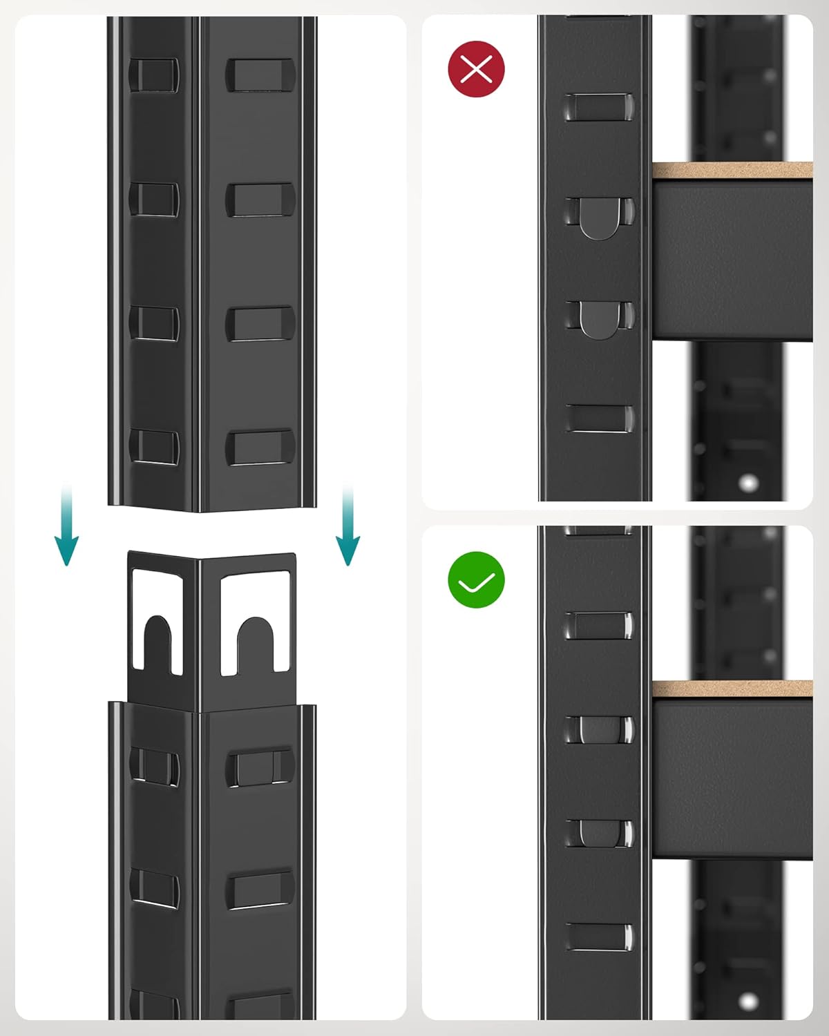 Verstelbare planken: de montage van deze plank vereist geen schroeven. Dankzij de sleuven kunnen de onderdelen eenvoudig aan elkaar worden gekoppeld en is de hoogte tussen de planken flexibel naar wens aan te passen.