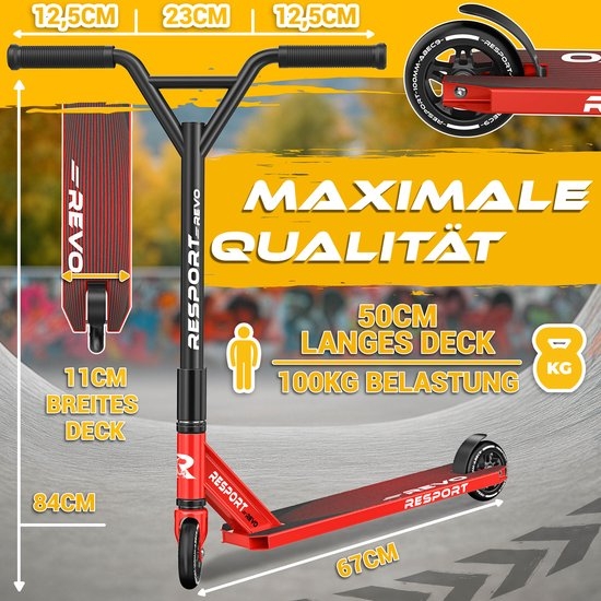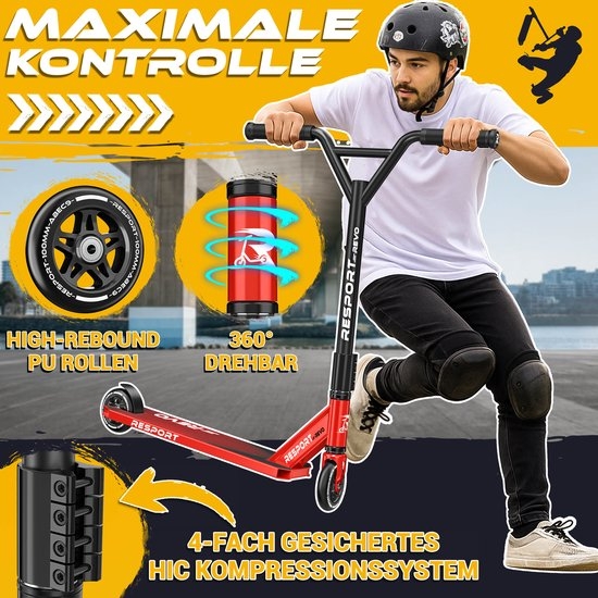 MAXIMALE STABILITEIT & PROFESSIONELE CONSTRUCTIE: De professionele stuntstep RE:SPORT REVO is ontwikkeld voor skateparken, halfpipes, ramps en de straat. Hij combineert een stevig aluminium frame, een versterkte balhoofdbuis en een nauwkeurig HIC-compressiesysteem. Het 48 cm brede Y-stuur is krasbestendig, UV-bestendig en perfect uitgebalanceerd. Een hoogwaardige en leuke step voor zowel beginners als gevorderde rijders. ANTISLIP PRO DECK & WENDBAARHEID: Het 50 cm lange en 11 cm brede deck van deze stuntstep biedt een stabiele stand tijdens snelle landingen en op hoge snelheden dankzij de hoogwaardige griptape. Het slanke ontwerp maakt de step extreem wendbaar, waardoor sprongen, grinds en bochten gemakkelijk te maken zijn en maximale controle gegarandeerd is. Met slechts 3,3 kg is deze step licht, draagbaar en ideaal voor freestyle training. SNELHEID & 360° BEWEGINGSVRIJHEID: De 100 mm PU-wielen met hoge veerkracht, een stabiele aluminium kern en ABEC-9 kogellagers zorgen voor hoge snelheid en soepel rollen – waardoor deze citystep perfect is voor tricks, stunts, freestyle moves, barspins en tailwhips. De 360° draaibare vork maakt vloeiende trickcombinaties en strakke spins mogelijk. De krachtige flexrem zorgt voor betrouwbaar remmen, zowel binnen, buiten als op een helling. Ergonomische grip: De 150 mm TPR-handvatten bieden een antislip grip, absorberen trillingen en zorgen voor een veilige ondersteuning tijdens intensieve sessies. De ergonomische Y-stang zorgt voor balans en controle – ideaal voor kinderen, tieners en volwassenen. De robuuste step kan tot 100 kg dragen en is geschikt voor street riding, park tricks en dynamische stuntmanoeuvres. Snelle montage & klaar om te rijden: De citystep is binnen enkele minuten klaar voor gebruik en dankzij het compacte ontwerp gemakkelijk te vervoeren. De meegeleverde stepstandaard zorgt ervoor dat de prostep altijd veilig geparkeerd staat. Een perfecte stuntstep voor zowel beginners als professionals, die design, prestaties en stabiliteit combineert en indrukwekkende resultaten levert op elk terrein. Of je nu nieuwe trucs oefent, snelheid opbouwt of je techniek verbetert tijdens intensieve trainingssessies.