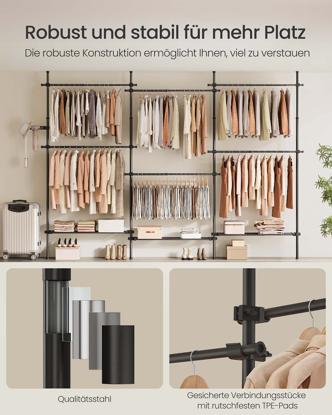 Eenvoudig te monteren: Dit is een doe-het-zelf en uitbreidbaar garderobesysteem. U kunt het naar wens samenstellen, de montage is zeer eenvoudig en kan worden uitgevoerd zonder ingewikkeld gereedschap. Wij leveren de benodigde accessoires en instructies, zodat u veilig kunt winkelen.