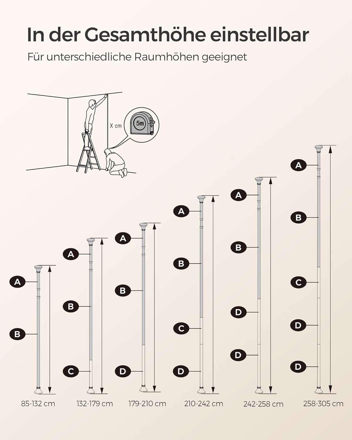 Het plaatsen van het doucherek is eenvoudig. Het doucherek kan passen worden gemaakt door het juiste aantal stangdelen te kiezen. Met het uitschuifbare stangdeel kunt u het douchrek uiteindelijk op de juiste hoogte in stellen. Het doucherek wordt geleverd met handleiding.