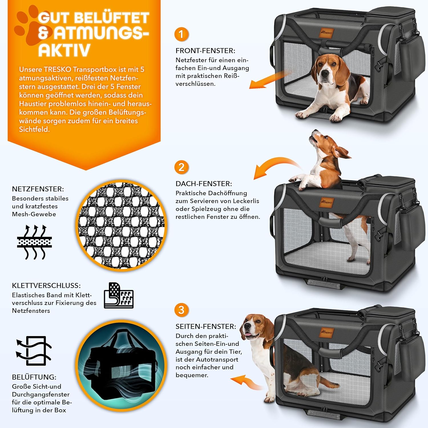 INTELLIGENTE CONSTRUCTIE: Onze hondenmand is gemaakt van scheur- en krasbestendig materiaal en biedt een stabiele en duurzame transportoplossing voor honden van alle groottes. Hij is ontworpen om jarenlang gebruik te weerstaan en uw hond veilig te houden. De openingen aan drie zijden (boven, voor en opzij) zorgen bovendien voor een extra groot gezichtsveld. Alle in- en uitgangen zijn voorzien van een vergrendeling.