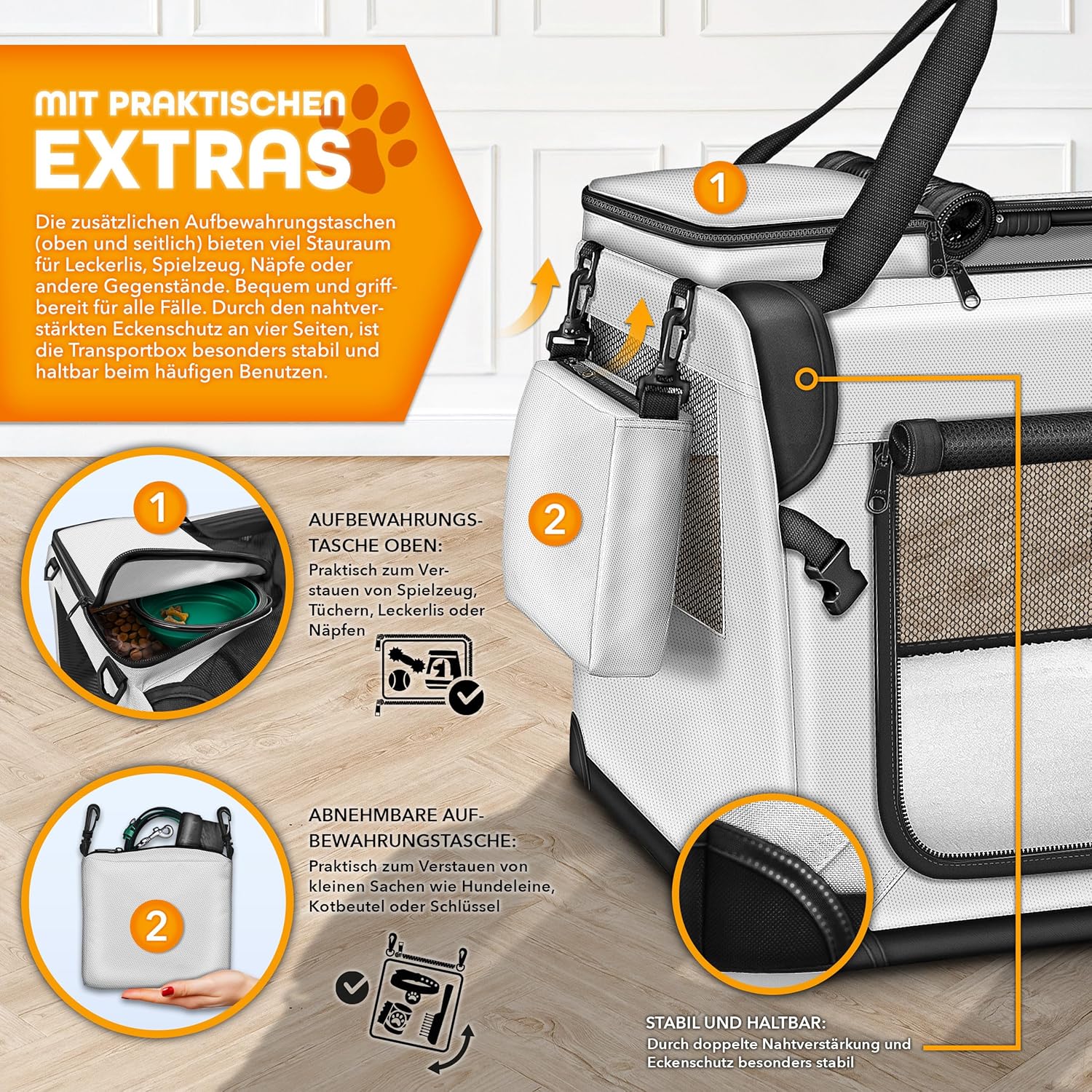 GEMAKKELIJK & VEILIG: De hondenbench kan met twee riemen stevig in de auto worden vastgezet. Twee stevige zijflappen en een riemgeleider zorgen hiervoor. Onze box is ideaal voor onderweg en op reis en is gemakkelijk op te bergen. De gevoerde handgreep maakt de hondenbench ook gemakkelijk mee te nemen. Tot de accessoires behoren een siliconen likmat met zuignappen en een spatel voor het verdelen van voer.