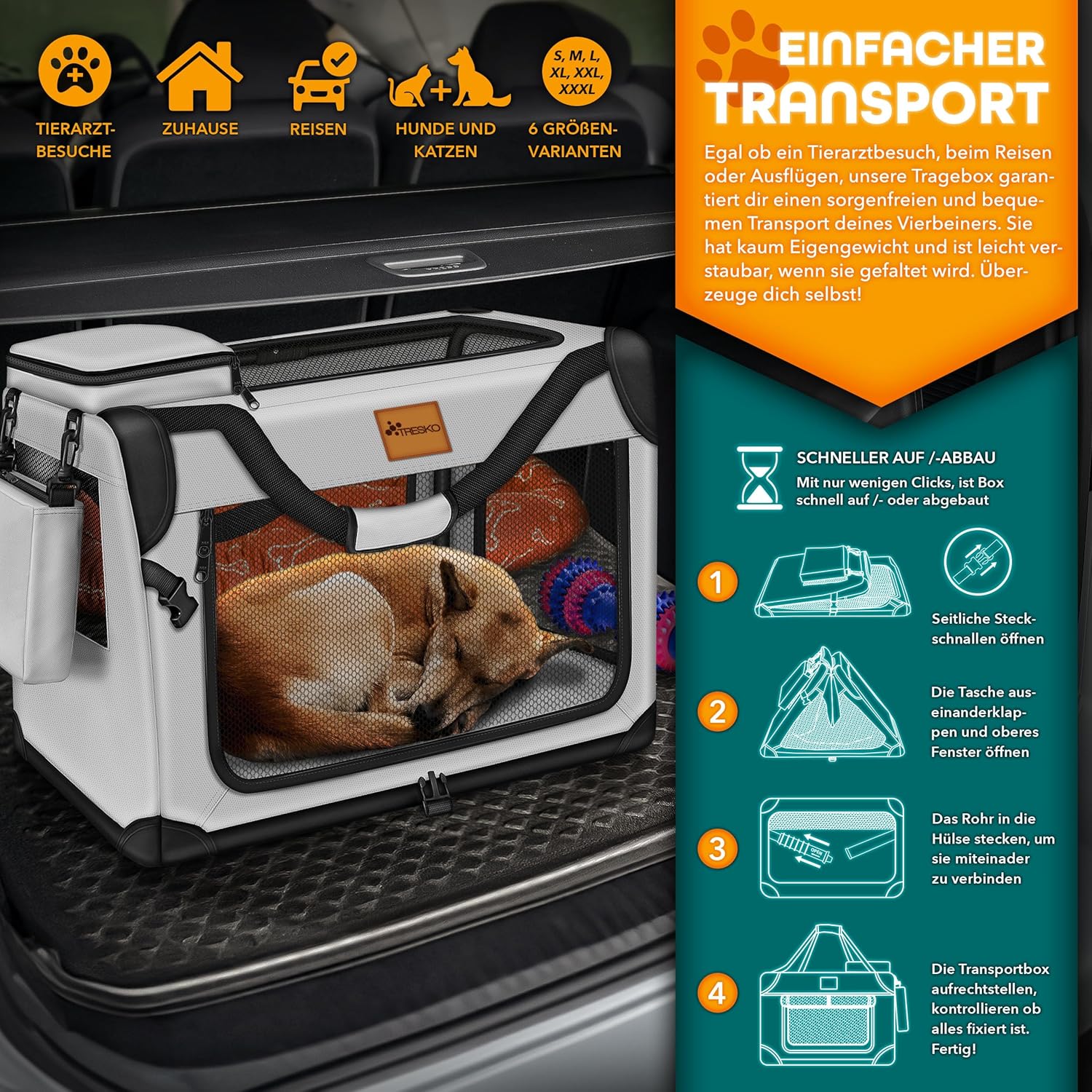 RUIMTE VOOR ALLE MATEN: De hondenmand is opvouwbaar en verkrijgbaar in verschillende maten, waardoor er voldoende ruimte is voor kleine, middelgrote en grote honden of katten. De volledige buitenhoes van de TRESKO hondenmand is afneembaar en machinewasbaar. Vlekken of ander vuil kunnen worden verwijderd met een vochtige doek of borstel.