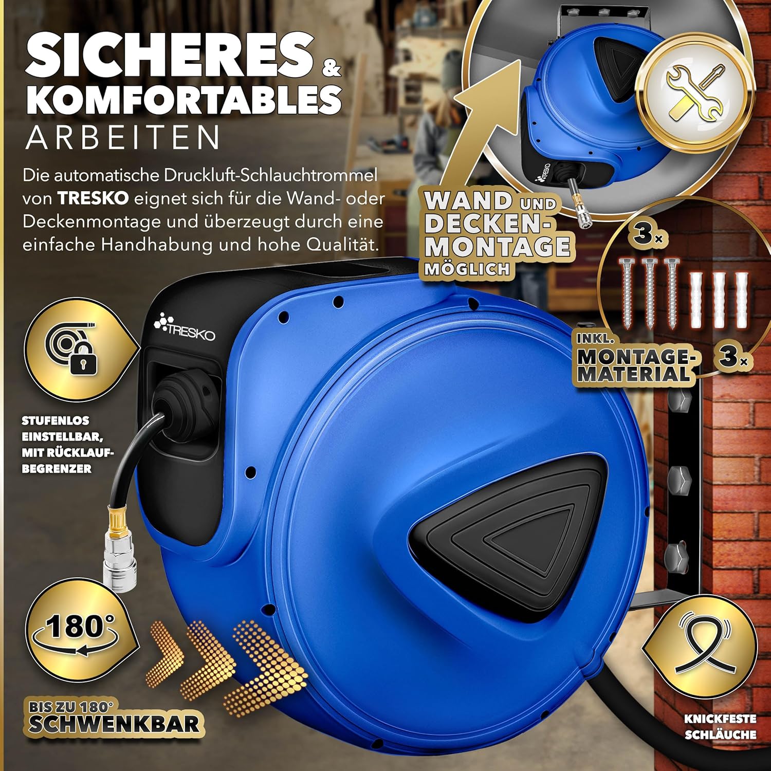 Tresko – persluchtslang met haspel – 20 meter – draaibaar – max 18 bar – blauw