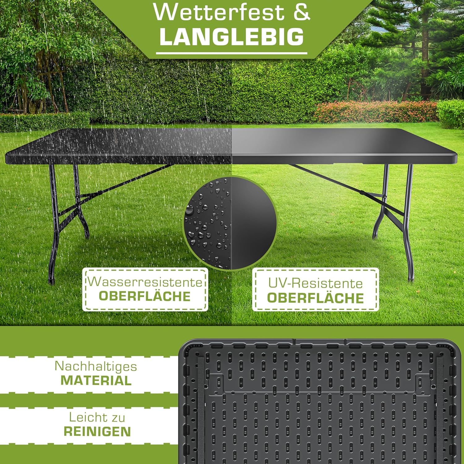 Deze inklapbare tuintafel met een lengte van 180 cm is bijzonder snel en eenvoudig op te bouwen Ideaal als eettafel of nuttige legplank te gebruiken De klaptafel is gemaakt van robuust, weerbestendig kunststof met stalen frame en is bijzonder stabiel en stabiel.