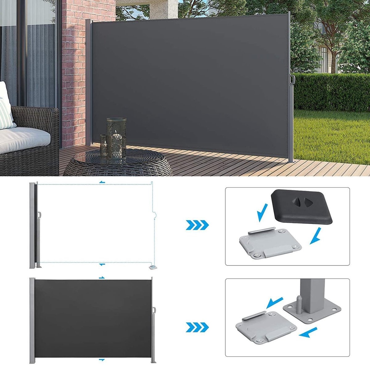 Deze zijluifel beschermt u tegen de nieuwsgierige blikken van uw buren. Zo kunt u ongestoord ontbijten op uw terras. Trouwens, de kinderbeveiliging op het handvat maakt deze luifel nog betrouwbaarder