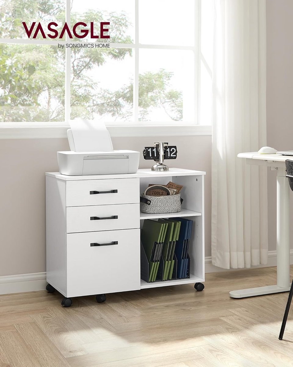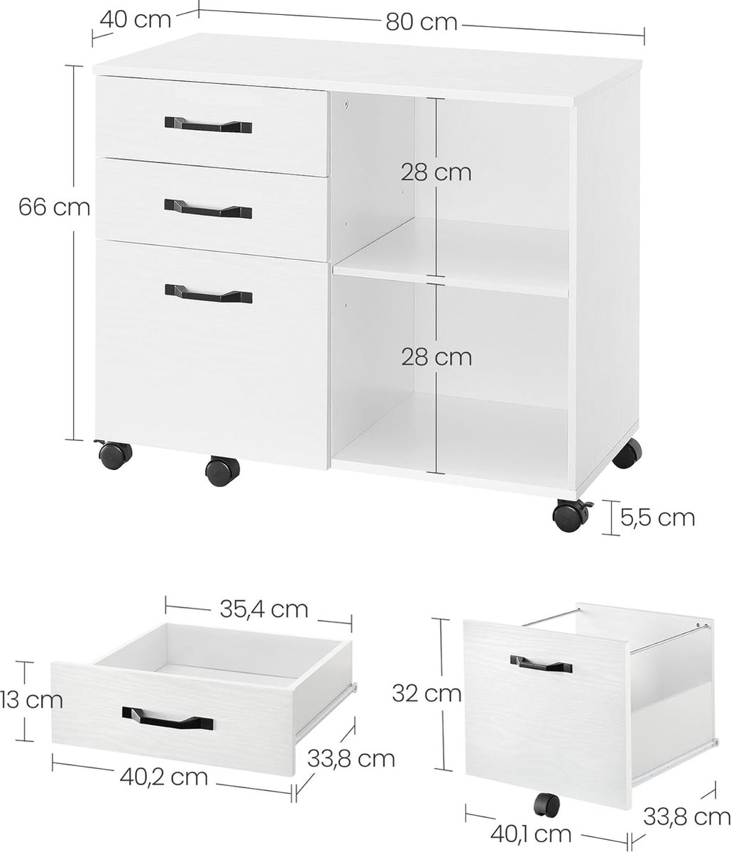 - Veel opbergruimte: 1 groot werkblad met een afmeting van 40 x 80 cm voor je printer, 2 open vakken voor je boeken en 3 laden voor je documenten en kantoorbenodigdheden. Met deze ruime rolcontainer creëer je een nette werkkamer
