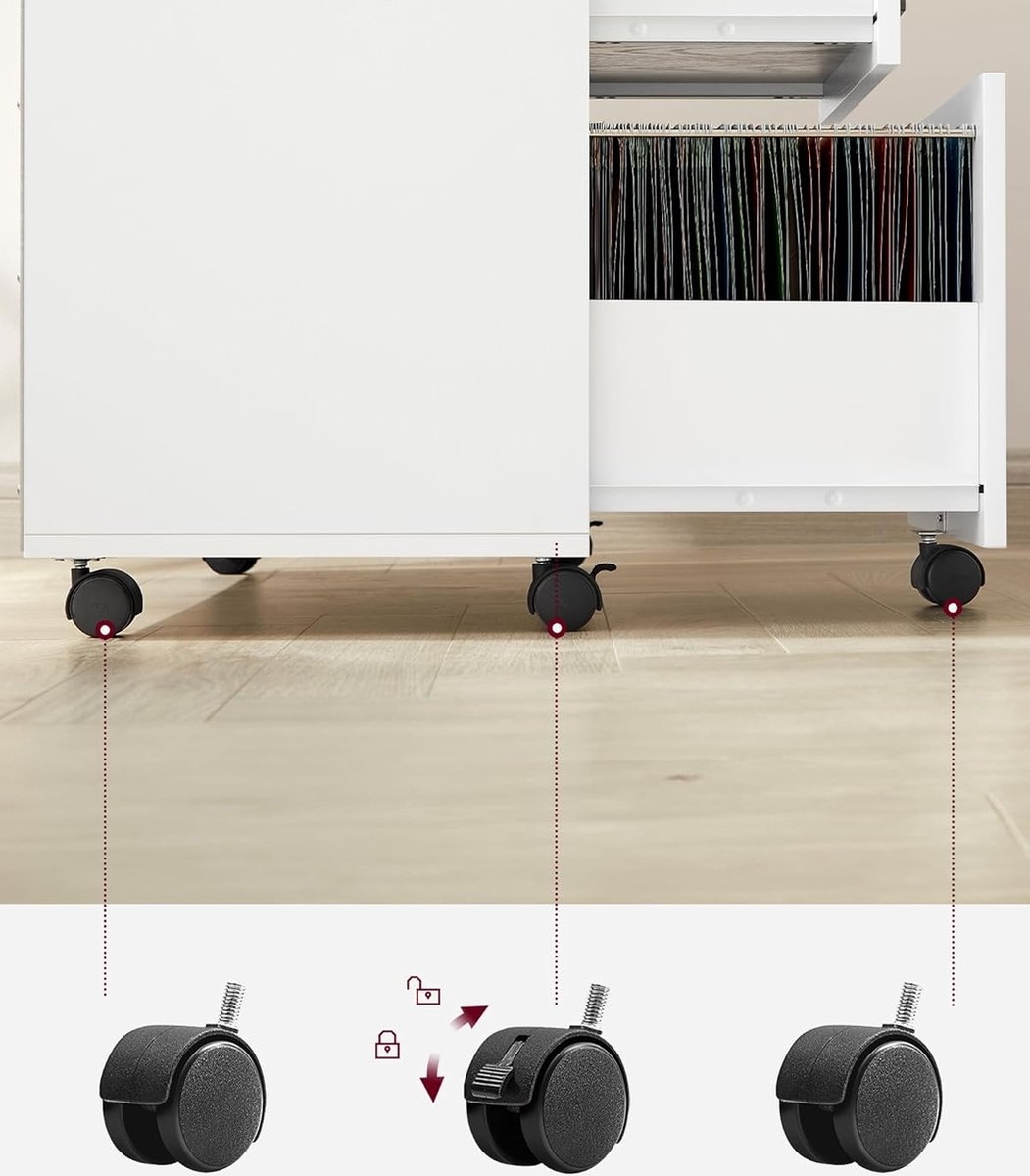 - 360° draaibare wielen, vergrendelbaar: de bureaukast is met 5 360° draaibare wielen, waarvan 2 fixeerbaar zijn, wat hem zowel mobiel als stabiel maakt. De rol voor onder de laden beschermt tegen omvallen en biedt extra stabiliteit