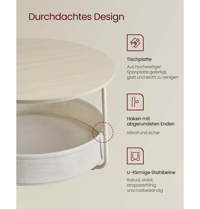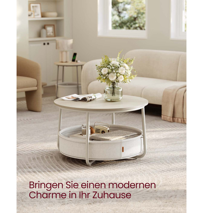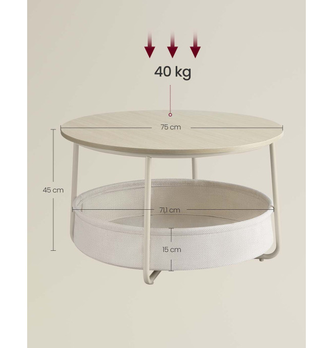 Deze moderne ronde salontafel met een diameter van 75 cm en een hoogte van 45 cm is een perfecte aanvulling voor je huis. Het eigentijdse design geeft een elegante touch die perfect in verschillende interieurstijlen past. Met een ruime mand van dubbellaags polyesterweefsel biedt hij praktische opbergruimte voor dekens, kussens en boeken, terwijl de robuuste spaanplaat en de stalen U-poten voor stabiliteit zorgen. Dankzij de duidelijke handleiding is de montage eenvoudig en snel, zodat je direct kunt genieten van het gemak en de elegante charme van deze salontafel.