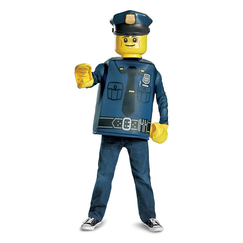 Het Lego Politieagent jongenskostuum bestaat uit een bovenstuk voor kinderen, een masker en een paar handen. Exclusief schoenen of andere accessoires.